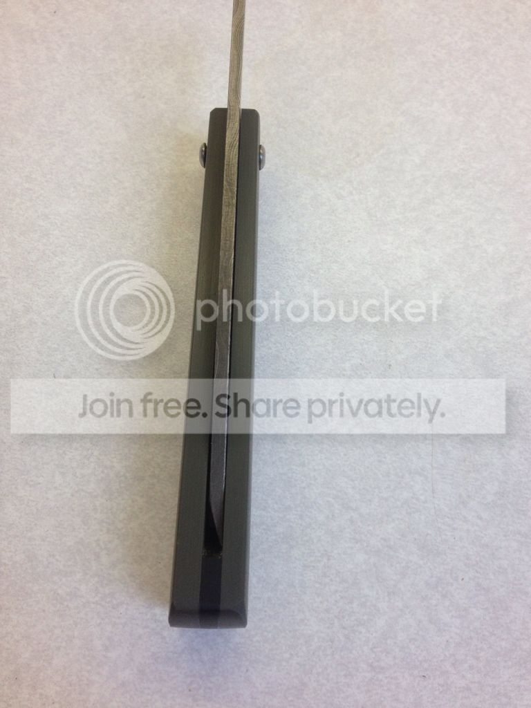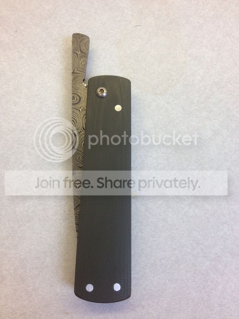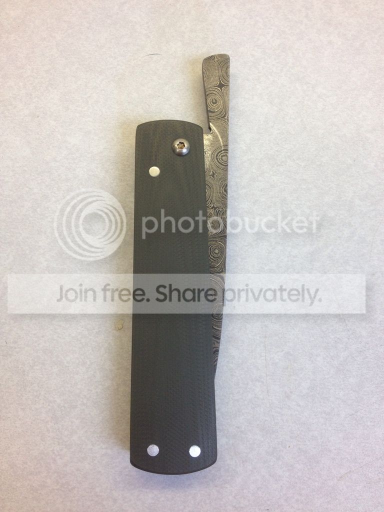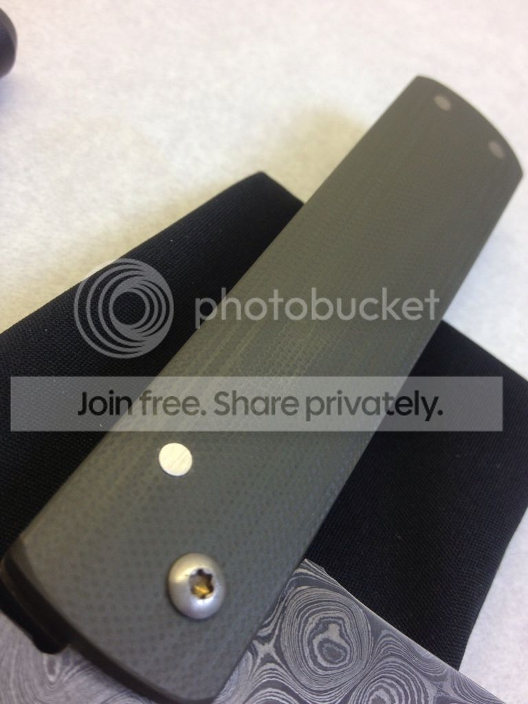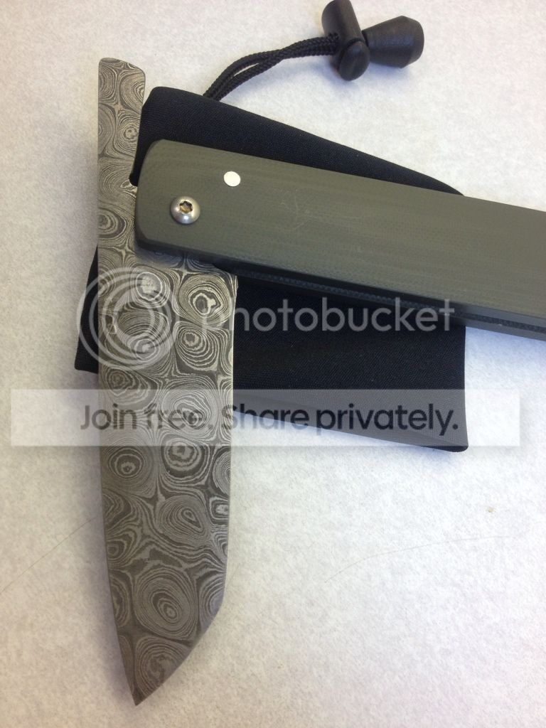 3 - Ivan Campos Friction Folder - $165 - 2012 Damascus w/ Ranger Green G-10 - Way cool "tanto" style friction folder with a BEAUTIFUL damascus blade with a chisel grind from Ivan Campos in Brazil. Lightly carried, lightly used. Changed the edge to more of a convex on one side than the original final bevel. Only letting go because I found out I like a knife that locks and I almost never carry it Theres a few marks around where the knife rotates, as well as a few small marks in the G-10 from bumping into other things in my pockets. The last few times I carried I've been using a black Benchmade baggy which I can include if you like