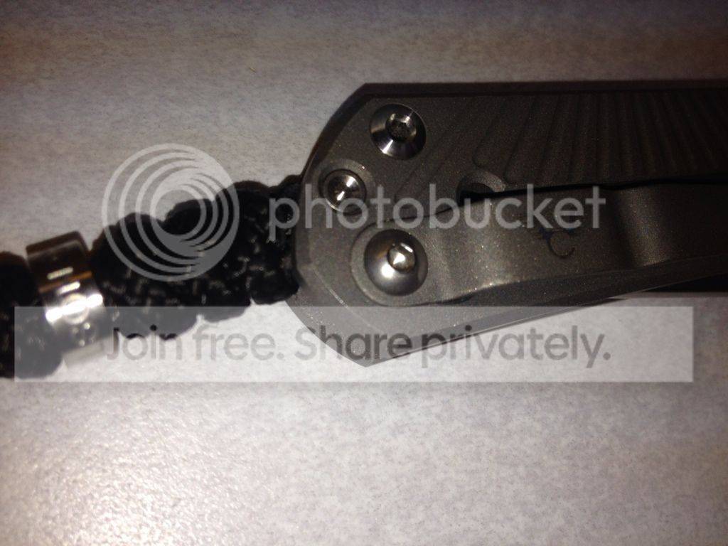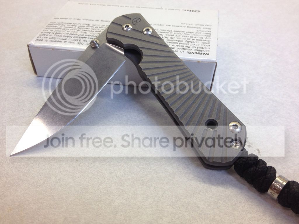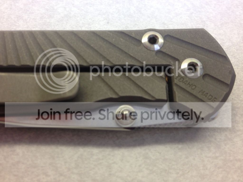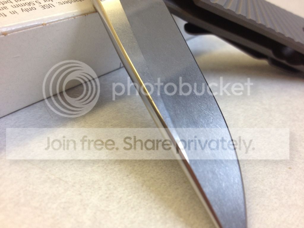 1 - CRK/ Wilson Combat small Starbenza - SOLD - DOUBLE LUG/ B-Day September 21, 2011 - just got this a week or so ago, I didn't care much for the regular Sebenza and thought I'd take a chance with the Starbenza but it's too small for my tastes, very good USED condition. Blade has factory edge and is still very sharp, starting to pick up quite a few carry marks on the lockside and the clip. Biggest thing worth noting is the small mark on the top of blade, I dropped the knife on some tile just right. You can barely feel it if you run your finger along the top of the blade and you have to be looking for it to see it. I tried to catch it in the pics Includes box/tool/birthday card, ETC