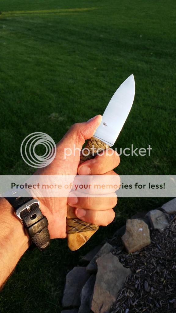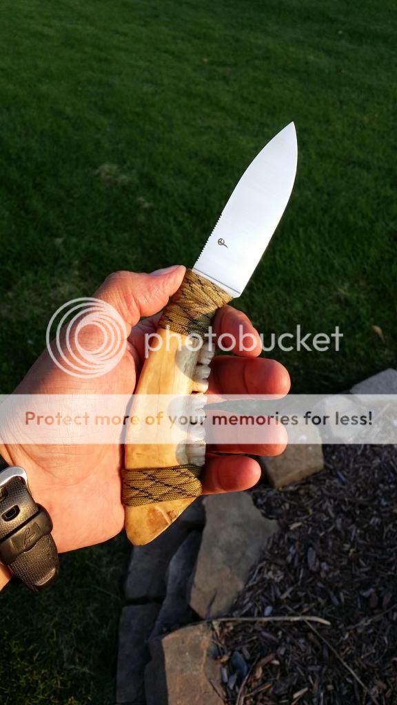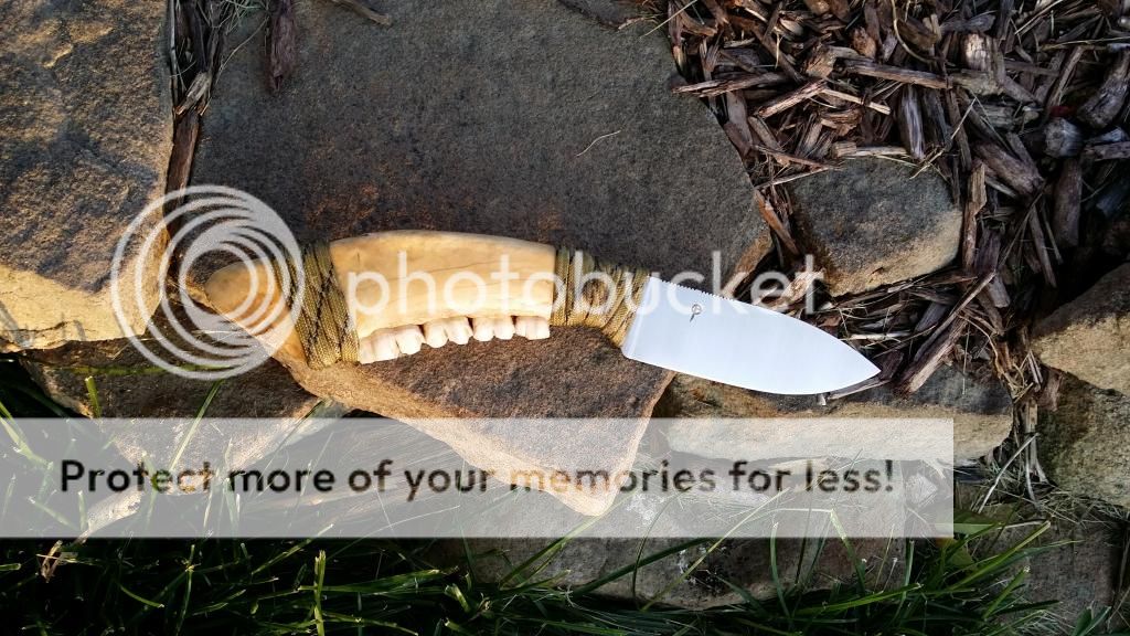 For sale is one EDC in CPM154 with a deer jawbone handle. For the handle I hollowed the jawbone and filled it with epoxy after the blade was inserted and pinned. The 550 covering the top and bottom joints is also epoxied in place. The teeth are epoxied in place as well and the points have been filed. I meant this project as a display piece but the knife is razor sharp and fully functional if you intend to carry and use it.