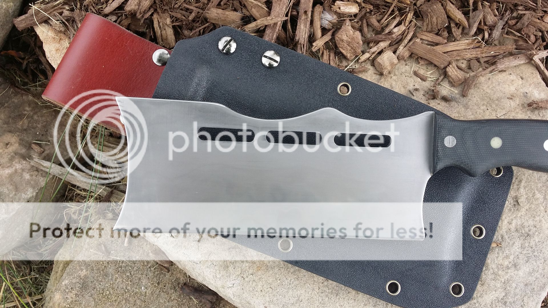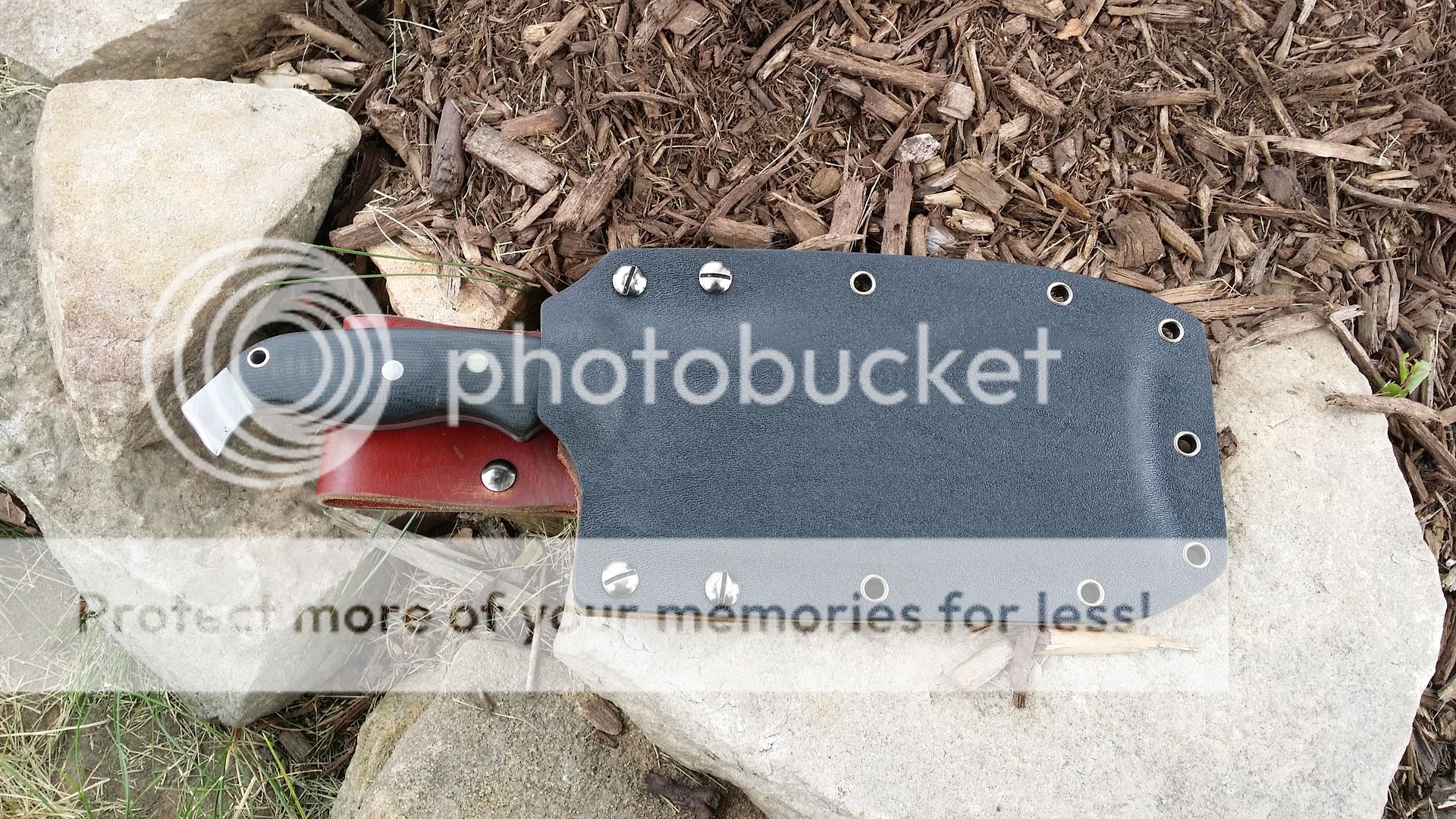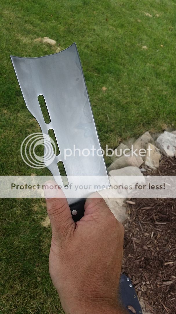 Its been quite a while since I was last able to get a blade to the forums been very busy with orders. For sale today is a W2 cleaver that I have been working on off and on for a few months. Blade was hand sanded to 2000 grit then etched to bring out the hamon. There is quite a bit more activity than what appears in the picture I am not having very good luck capturing it. The sheath is a hybrid leather and kydex with belt loop.