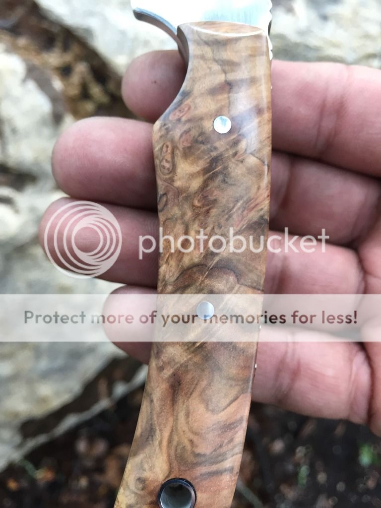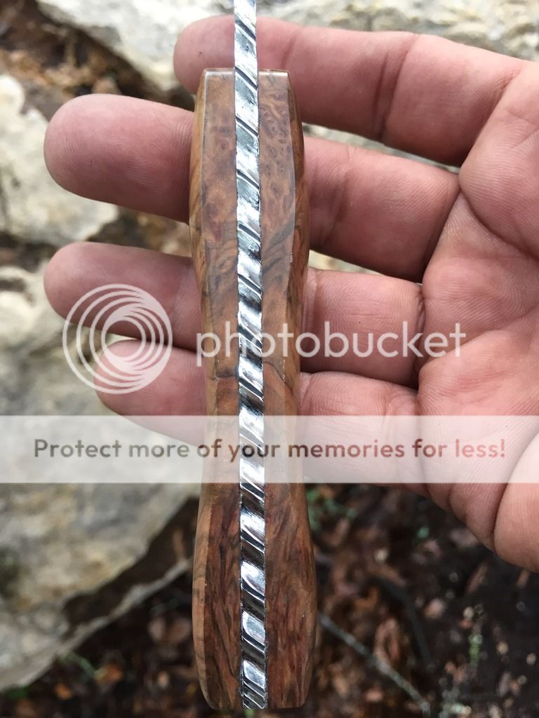 Fresh off the Grinder is a stainless beauty wrapped in awesome looking York Gum Burl Scales. I added a palm swell to the handles which give it a great fit and feel and also gives the knife some nice curves. Ive also added rope file-work along the spine which also helps with grip and adds the "custom" look.
