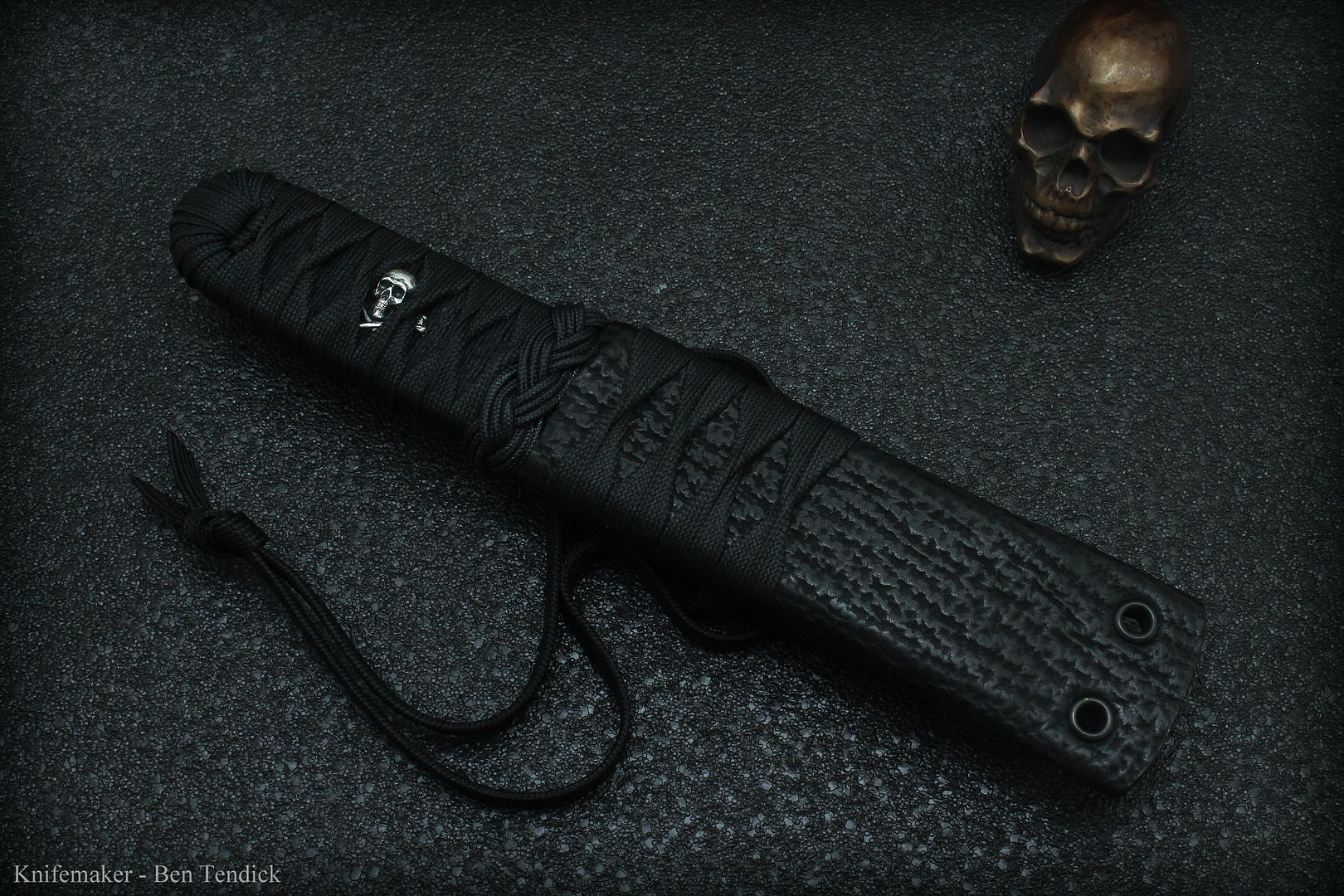 The Harstfield style sheath is Aluminum, wrapped in shark skin and lined with kevlar. The "sageo" adds grip when tucked in your belt, and also extends to act as a static cord.