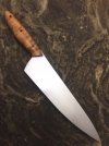 This time I have a very nice custom made Euro Chef's knife to offer everyone. The steel is CPM Magnacut which is a fairly new particle steel developed by Larrin Thomas and Crucible. The goal was to make a steel that was extremely corrosion resistant, had a very fine grain and carbide structure for excellent toughness, good wear resistance, while retaining high hardness. They really succeeded in their goal. Check out Larrin's discussion about Magnacut on his website in this link...https://knifesteelnerds.com/2021/03/25/cpm-magnacut/. This steel works well in a very broad range of knife uses from chopping/camp knives to kitchen cutlery. During corrosion testing, it beat just about every stainless steel out there with the exception of Vanax and LC200N. The heat treatment on this santoku was done in house and included a "cryo" soak to complete the quench and triple tempers bringing it to a final hardness of ~62HRC. At this hardness, the wear resistance in testing is very close to S35VN or CruWear to give you an idea of its edge retention,