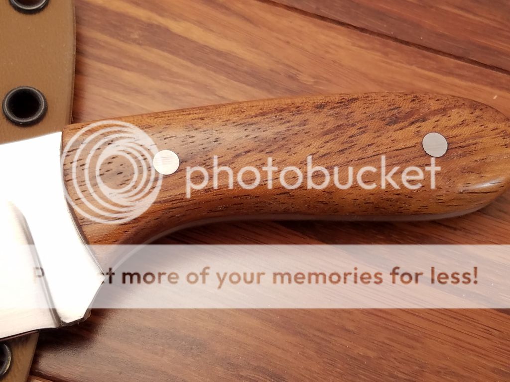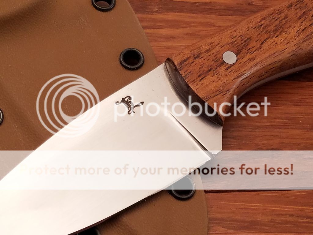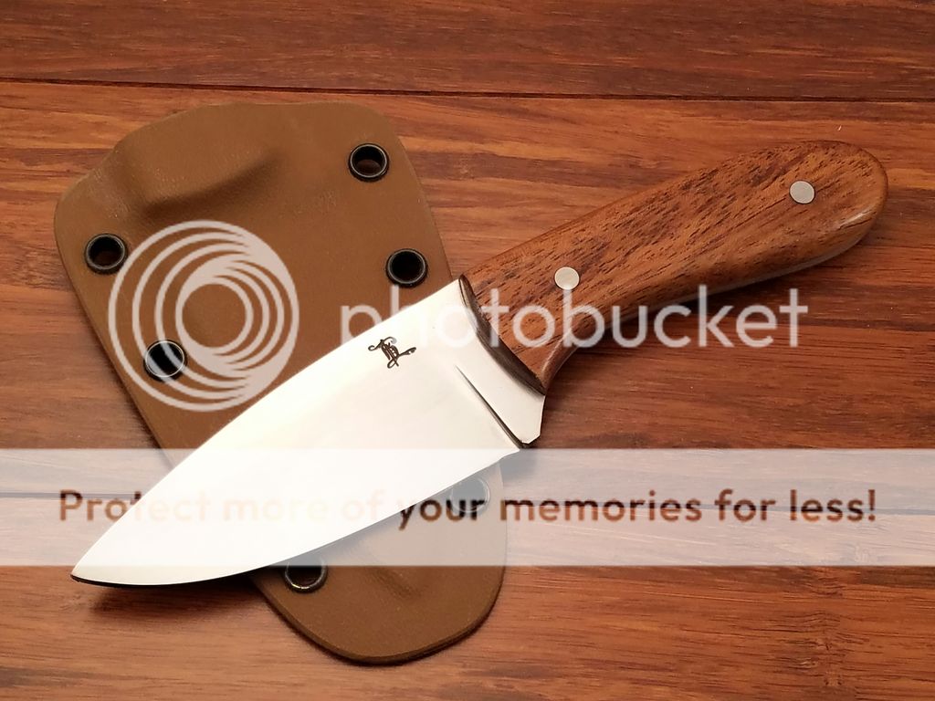 The next knife is my Sealgaire Pattern II. The blade is CPM154 with Philippine Mahogany and stainless hardware. It includes a tan kydex sheath set up for a small Tek-Lok. It has black G10 liners. The blade is flat ground with an 800 grit satin finish.