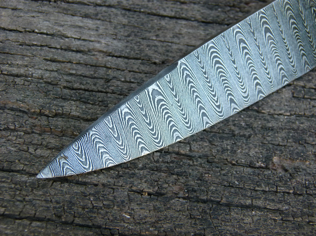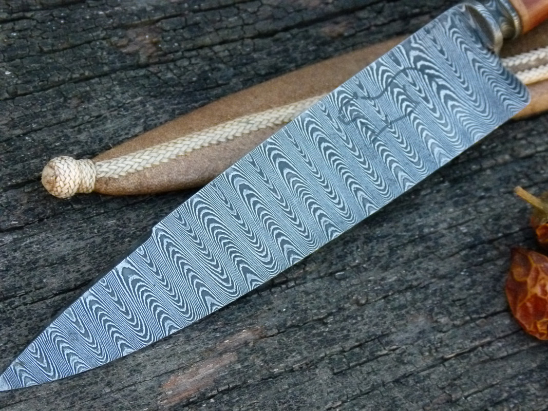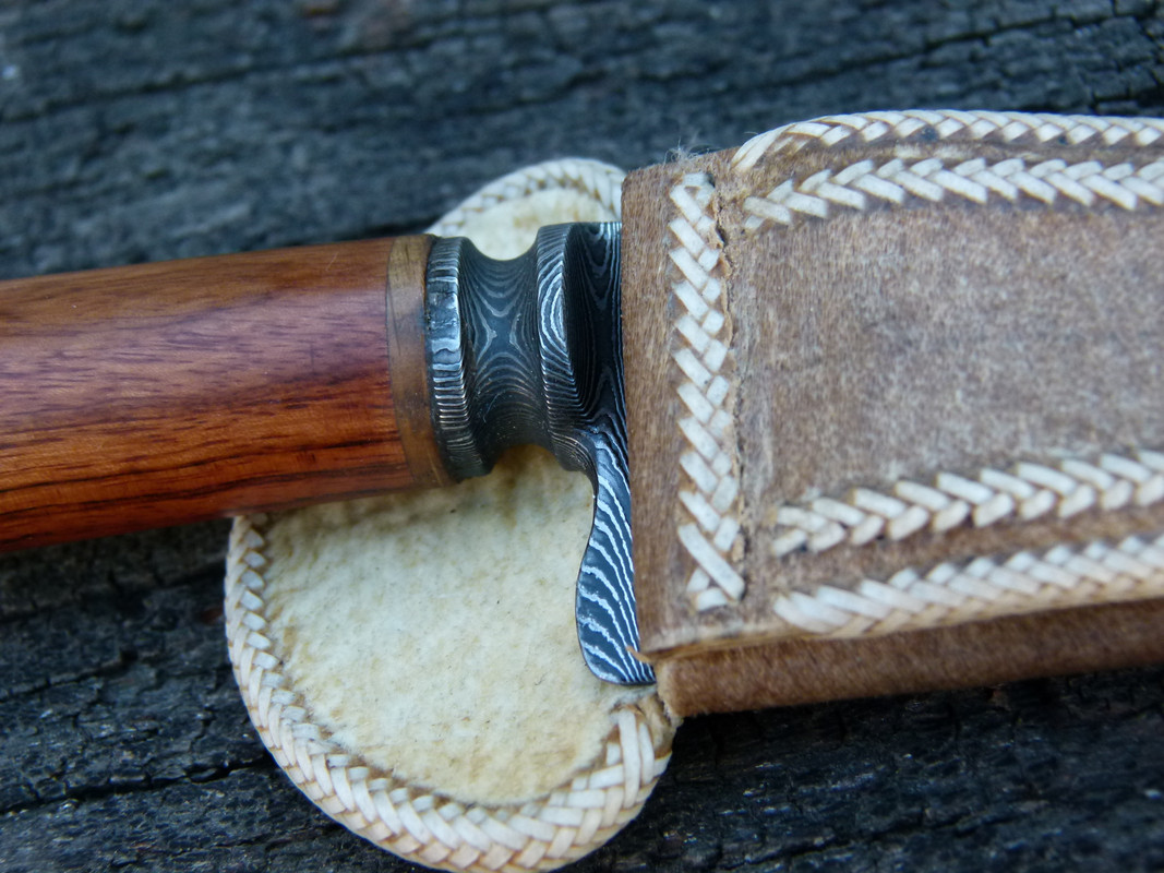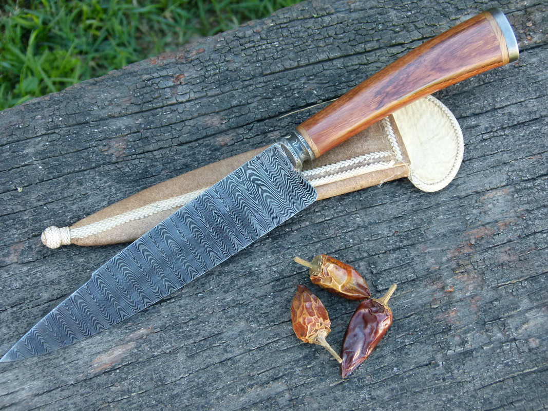 Today I leave a special piece for sale, it is a Creole knife, made of damascus steel pattern ladder, its button is worked with lime, the knob is also in damascus steel and is threaded to the tang, which makes a solid piece. it has a back edge of 1/3 of a blade. It is encased in urunday wood.