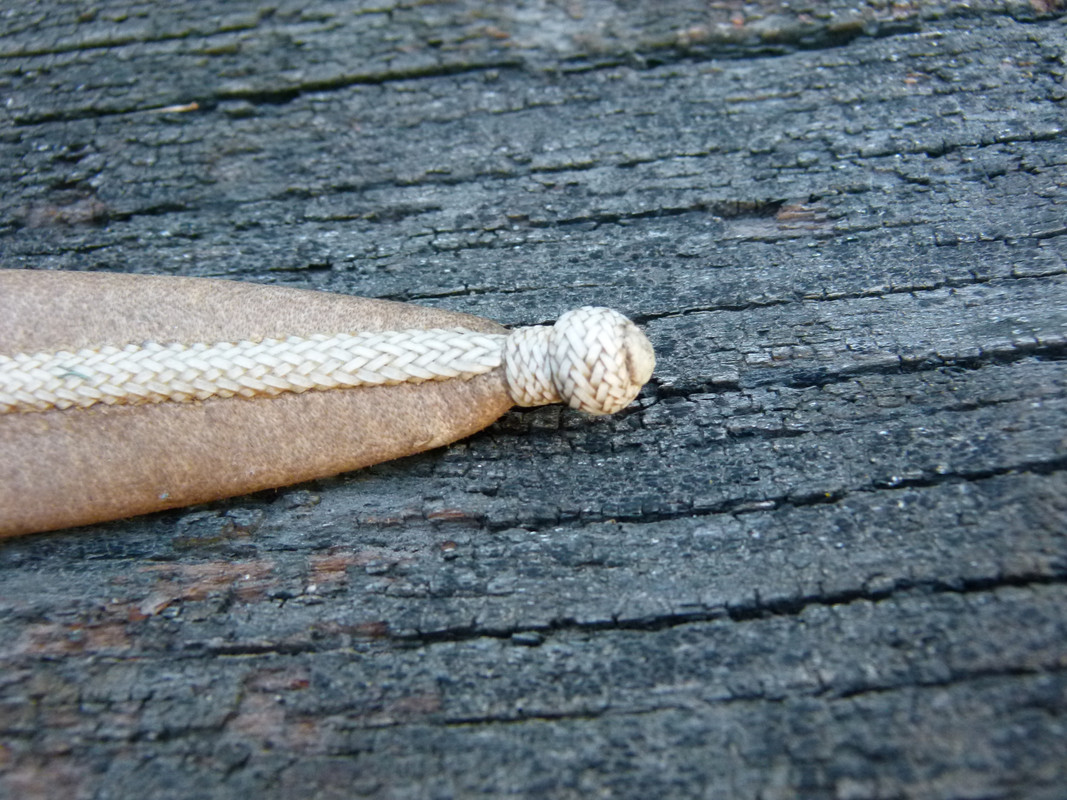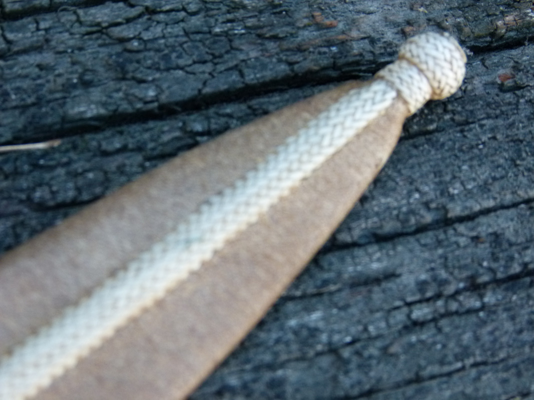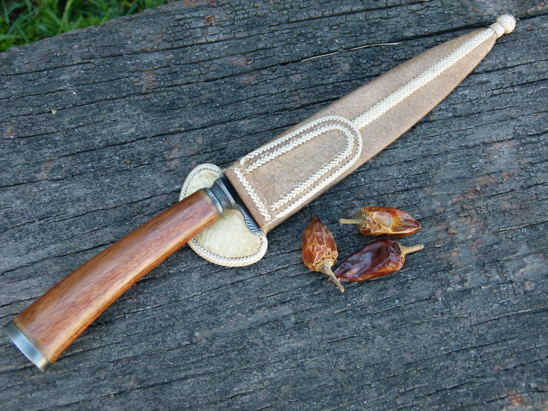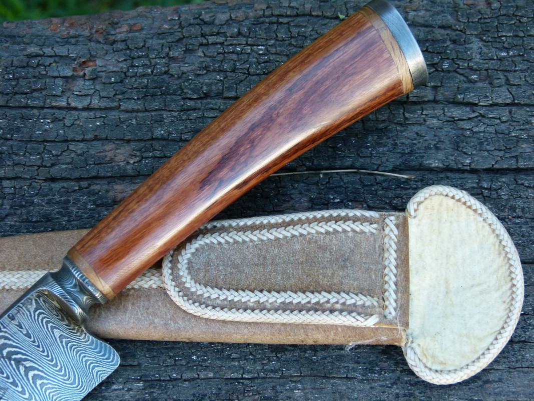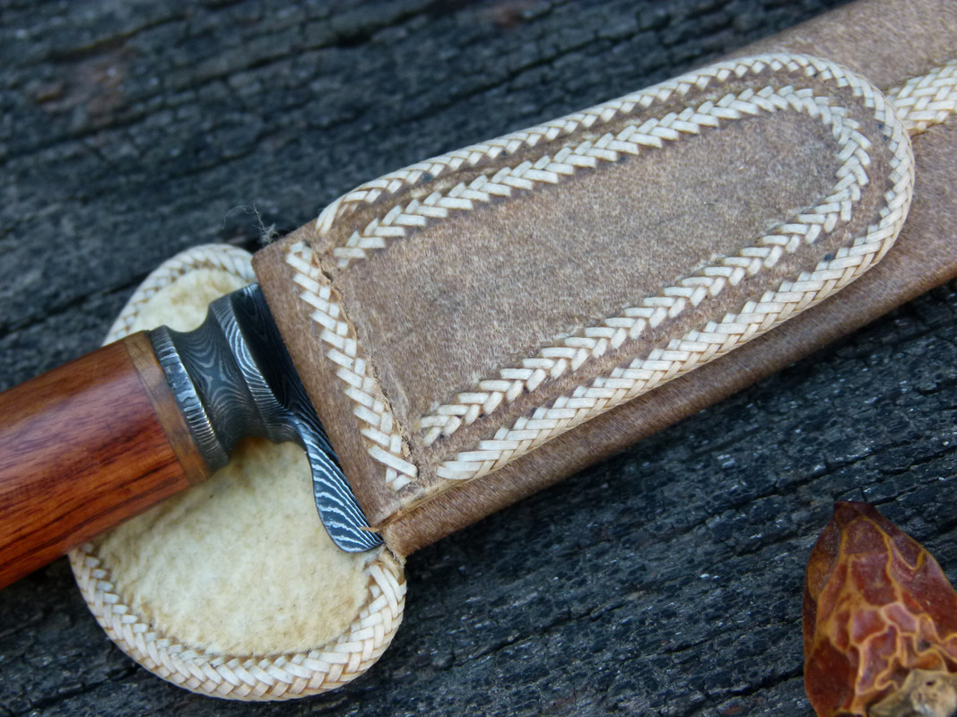 the sheath is woven by hand, with a remarkable neatness, fine rawhide threads. the length of the knife is 11 "and its useful edge measures 6.3"