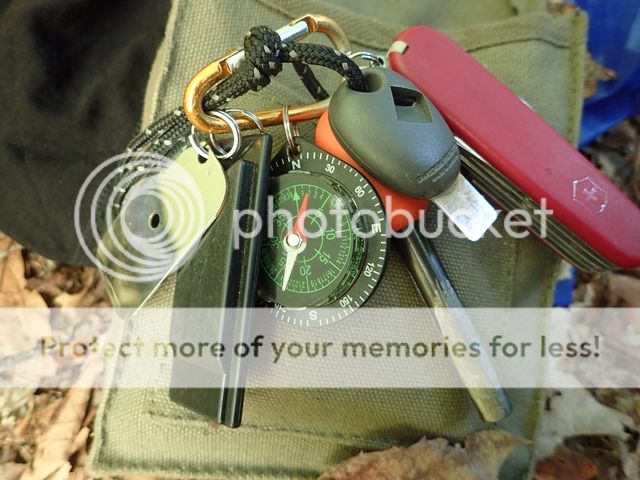 Still rocking the carabiner kit on my belt loop. Covers basic navigation, signaling, fire, and cutting tools.