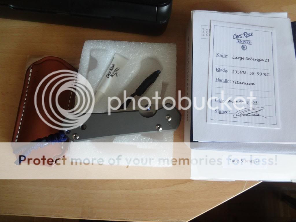 Hi all! Up for sale is a LNIB Large Sebenza 21. This knife has been used lightly and I have had it for about a month. The handles have no markings on it at all, the edge is still factory and very sharp. I have decided the large is a bit big for me so I'm selling to fund a small sebbie. Lock-up is very solid and perfect at 60% with no blade play in any direct and is very smooth. Centering is ever so slightly towards the lock side. DOB is August 13, 2013. I will be including a blue Chris Reeve lanyard as well as a knivesshipfree.com sheath which is a 12 dollar and 20 dollar value respectively. I'm asking $PF net paypal, priority mail shipping will be included. Thanks and feel free to send me any questions!