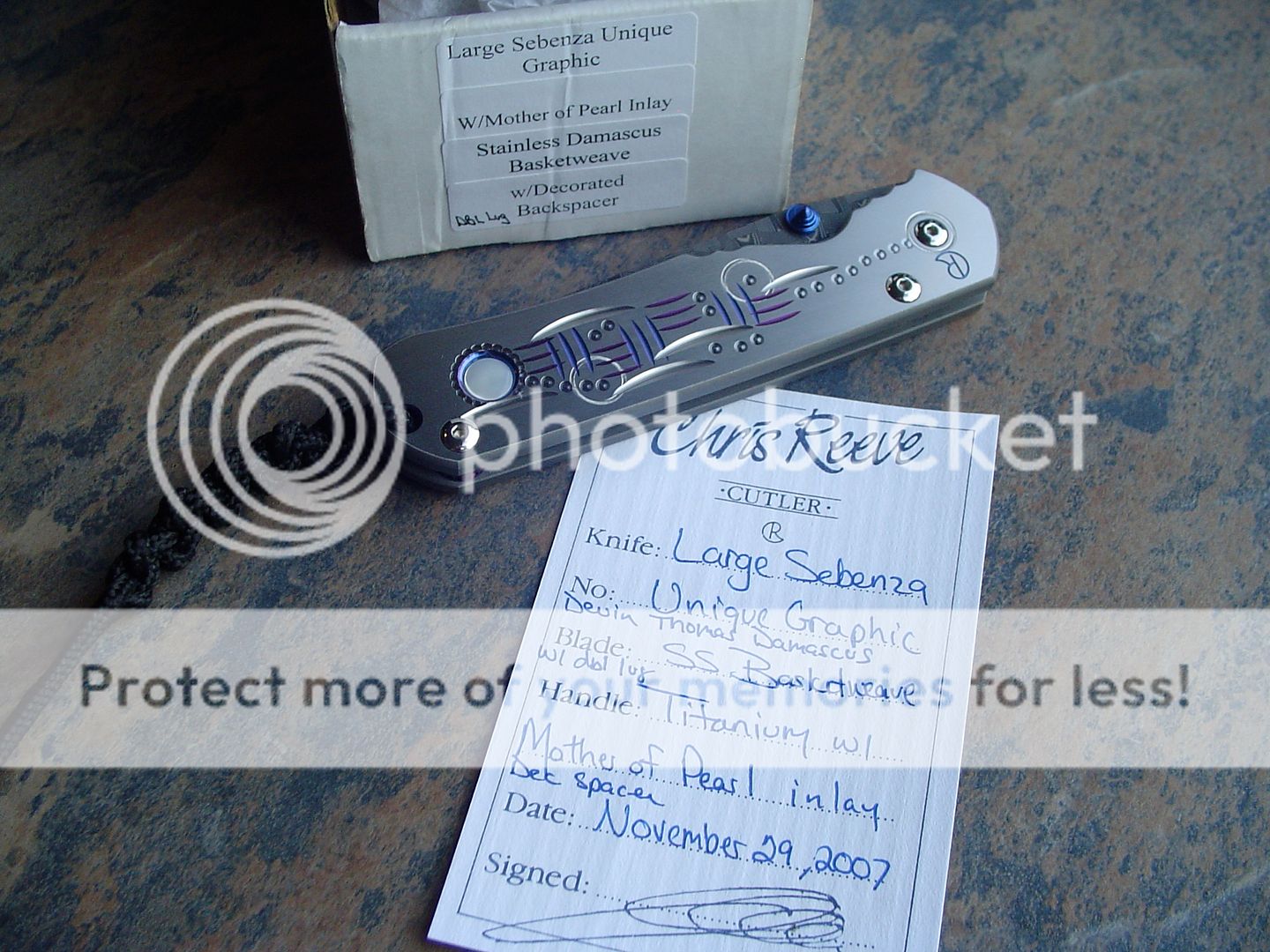 Here is a gorgeous Large Sebenza UG w/ Devin Thomas Basketweave. It also has a Mother of Pearl inlay and a decorated backspacer. Double blue lugs are also featured. Knife is in excellent condition. Never used or carried.
