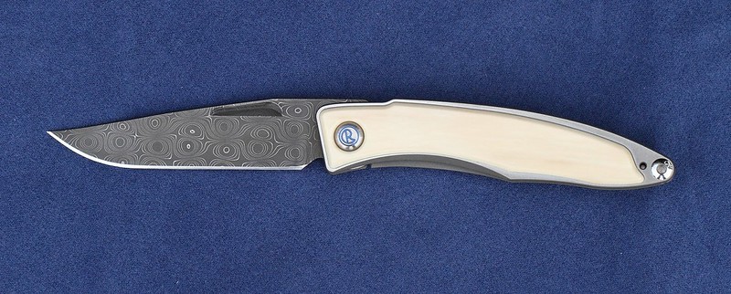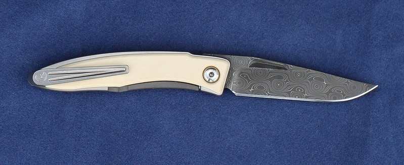 A new in box GORGEOUS!! cream color Mammoth Ivory Mnandi with Raindrop Damascus. It's 100% complete with everything as it came new. Offering a full refund less shipping if you aren't happy. Perfect blade centering and 50% lock up. A great word to describe this knife would be "elegant".