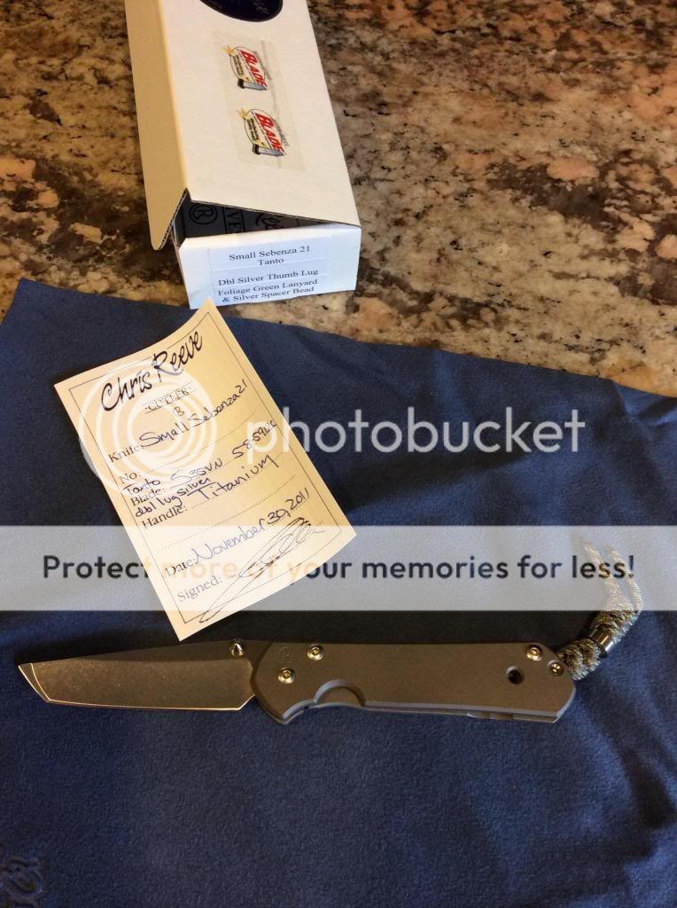 For sale is a CRK small Sebenza 21 Tanto with silver hardware, double thumb lugs, grooved stop pin, and the nicer lanyard with the titanium bead ( a TNK exclusive ). I bought this promptly when it came out thinking it would replace my Insingo as my EDC but just didn't use it. I don't remember ever carrying it but there are some minor rub marks on the clip, other than that the knife is like new. Although everyone sees these things differently I'd rate it at 99% or better condition. I'll let the pics do the rest of the talking for the knife.