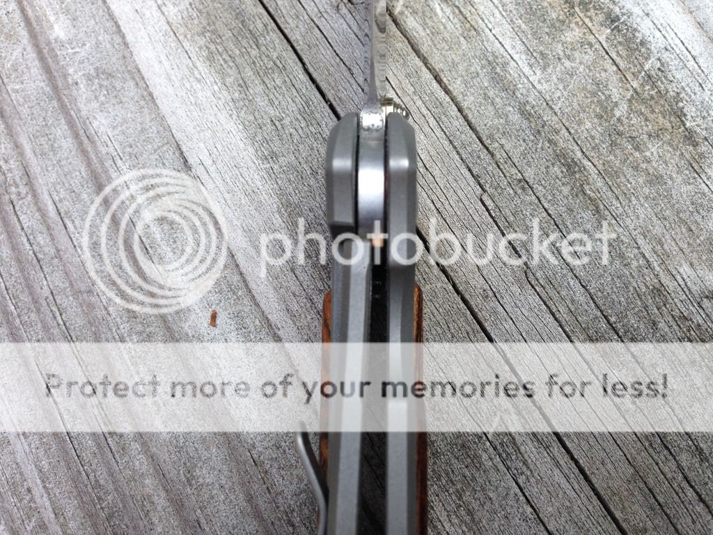 I am the original owner of this knife and have only used it to open a few boxes. The inlays on this one are awesome with nice tight grain. There are some scratches on the pocket clip and one small mark on the handle near the pivot. Please check out the photos as I tried to capture the entire knife focusing on any spots with minor wear. The blade is very smooth with great lockup, no blade play at all in any direction, and perfectly centered.