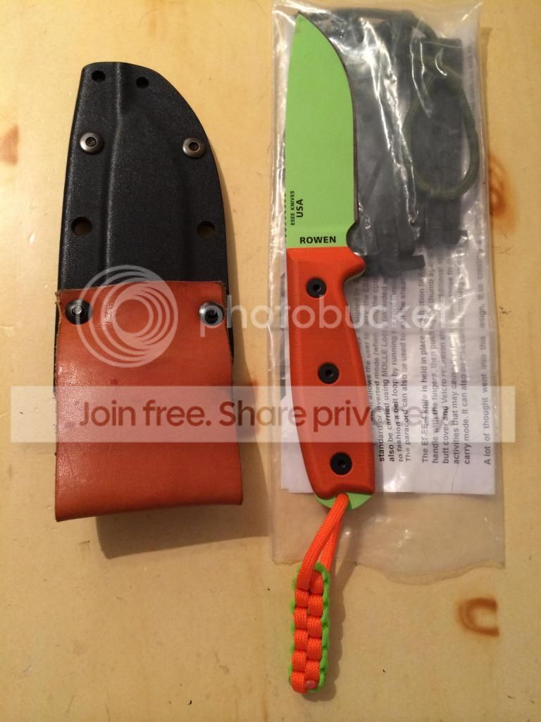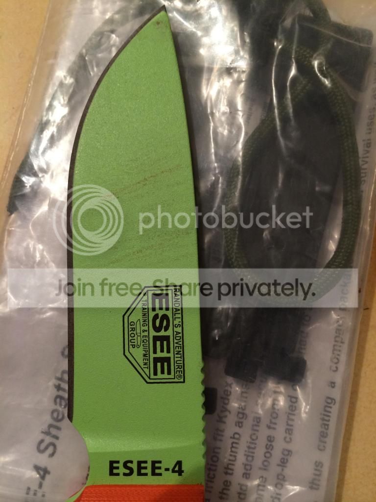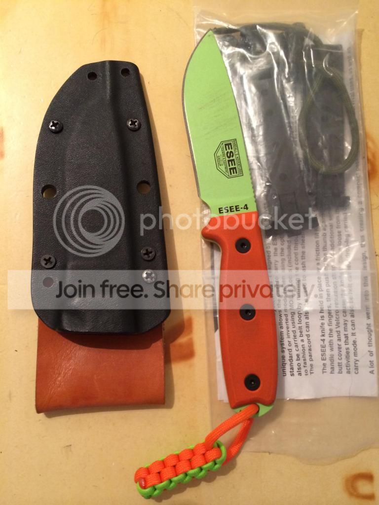 I also have an Esee 4 in orange / green. It has been used a couple of times, the coating on the blade is fine but there are marks on it from cutting wood. The knife is still sharp and in good condition. It comes with the sheath, molle clips, survival card and a leather loop for belt carry. See photos. I would like to trade this for a Bark River Bravo Necker or similar knife.
