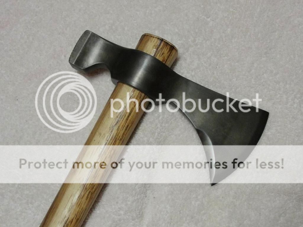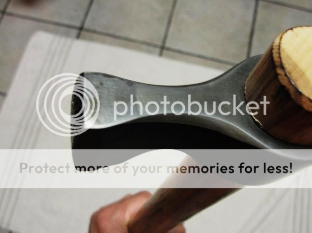 I was concentrating so much over the last 3 days working on this, that all the pics are of the completed work, including a hot bath for 15 minutes in some Apple Cider Vinegar to get some protective "blue" on the carbon steel bit. (for a "primitive" blue look) I also figured that if you already own this T-Hawk, you already know what the stock version looks like.