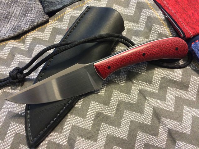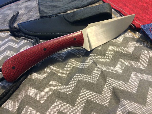 Handle: Shadetree red burlap micarta over white and black G10 liners.