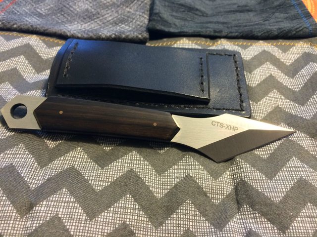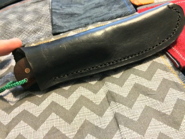 Sheath: Black leather right hand pouch, poor retention (does NOT hold knife when turned upside down)