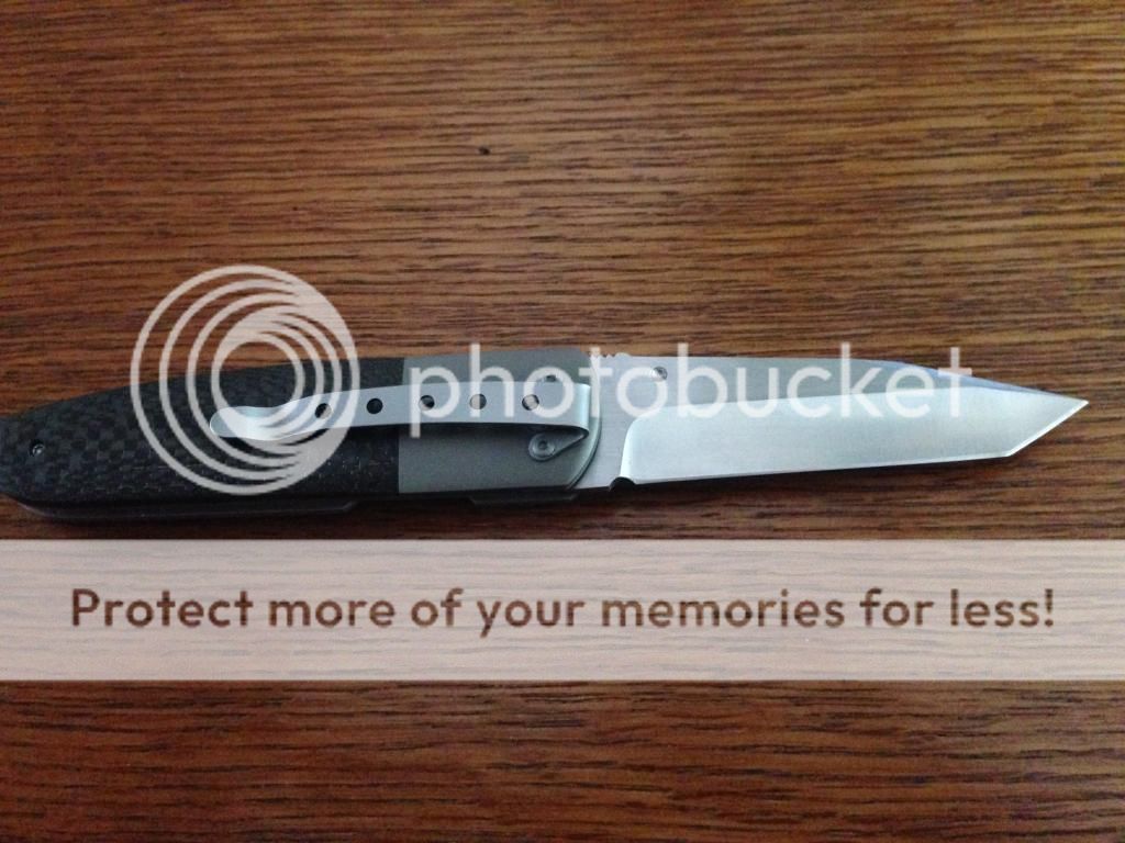 2.) Arno Bernard button lock. Like new 3.25 inch S35vn blade. Titanium with CF inlay. $275