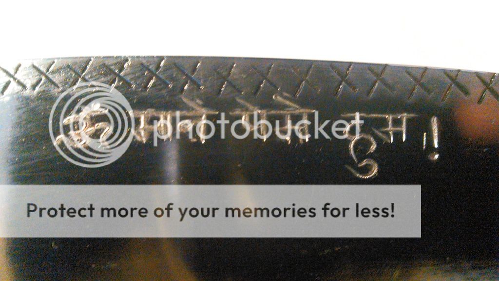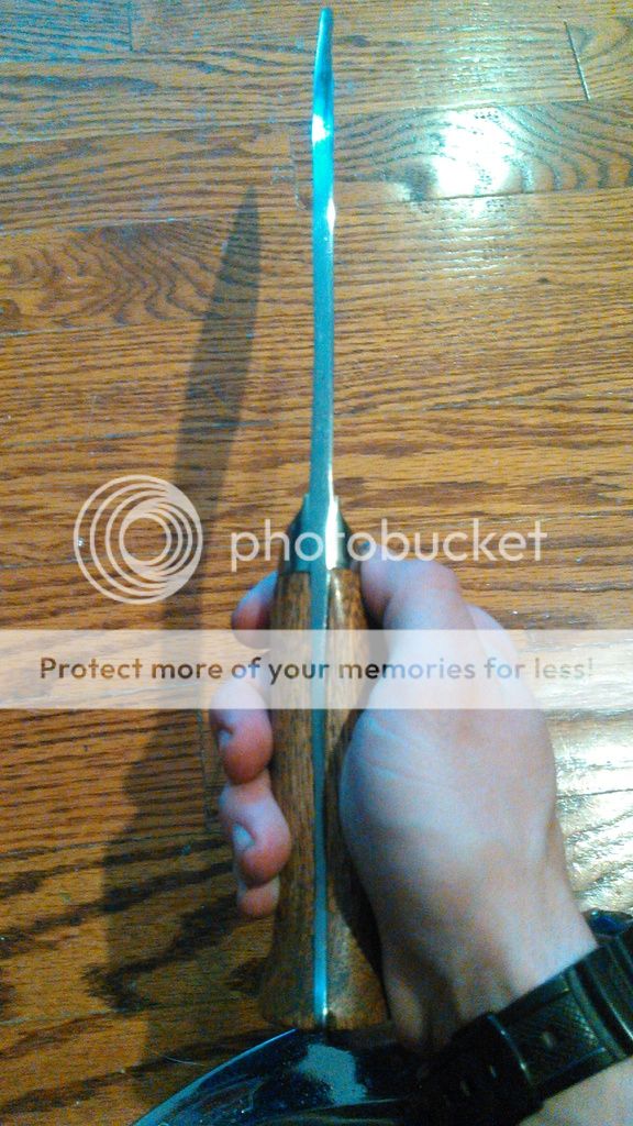 All I can say is wow. It came out almost exactly how I drew it, and even closer to what I had in my head. I did laugh when I saw the xs on the spine, just as Steve Tall had predicted, but it also had an awesome inscription, on which Im still waiting the translation. The knife itself is approximately 15.5 and just a bit over 22oz. Heavier and thicker than I pictured, but nonetheless true to spec. I would describe this as a kitchen/camp Bowie, more than a chefs knife, and you can really see elements of the Tamang in the knife, which was one of the inspirations for the knife. I love it, and Im pretty sure it would do just fine against branches, and possibly larger pieces of wood. This knife came almost hair-shaving sharp. Some parts of the blade could in fact take hair off my arm. I was beyond impressed at this point.