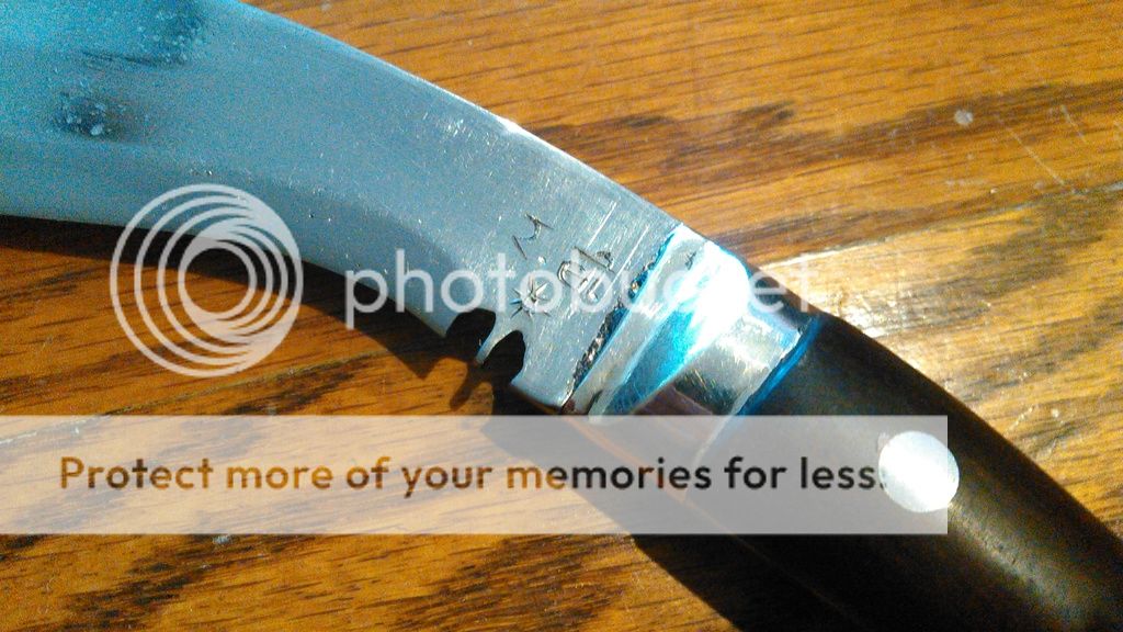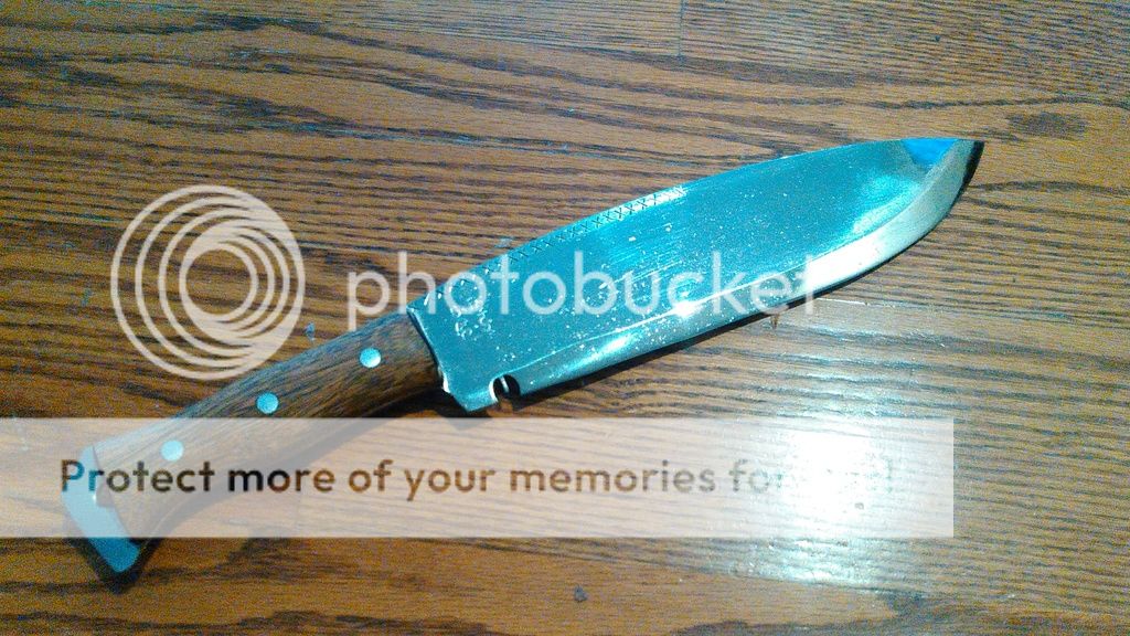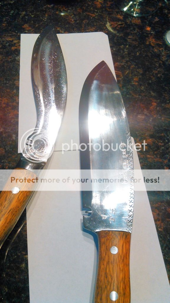 There is basically one modification for each design that I would like to see implemented on future versions. On the Cleaver, I think it would benefit from that extra inch of edge which would be created by changing that one angle. I made a note over a picture. On the Chefs Knife, it really needs fullers. Nice big, wide fullers, like on the KBDCs or a Foxy Folly. Took a pic of the 15 KBDC and Chefs Knife next to each other for reference.