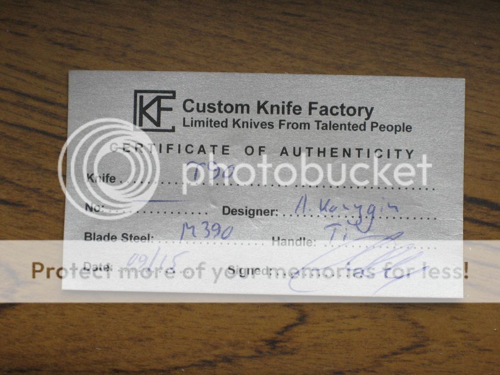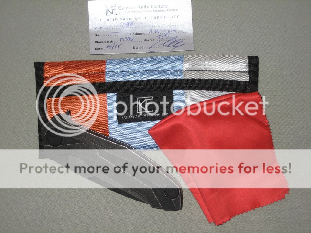 This is the Konygin T90 from Custom Knife Factory. It has just over a 4" M390 blade that rides on a ball bearing pivot and is 9.375" overall. The knife comes with a velcro pouch, micro fiber cloth, and a certificate of authenticity. It has never been carried or used and is in like new condition. I am selling for SOLD (includes all pp fees and shipping). I will ship CONUS only. First I'll take it with prompt payment gets it.