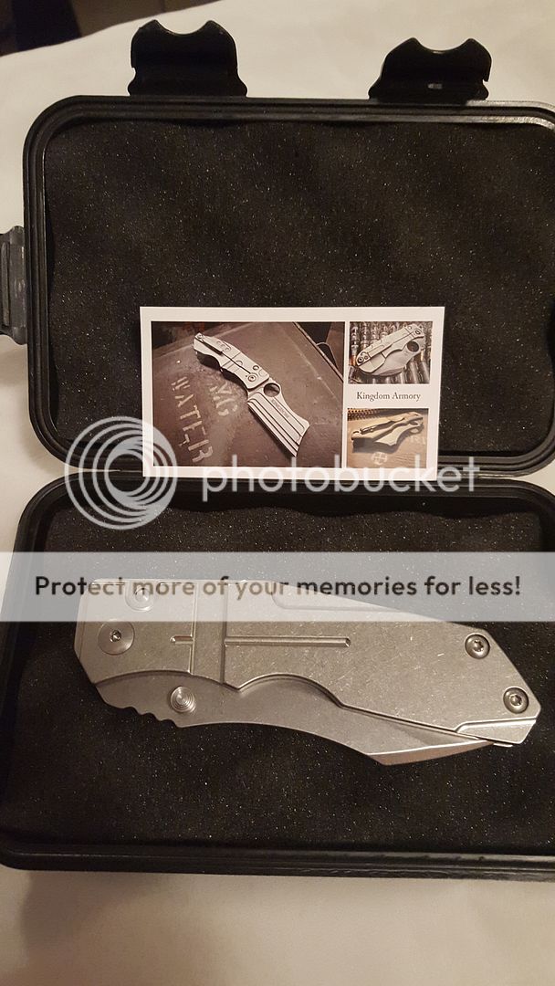 2. Kingdom Armory Samaritan (production model). BNIB - never carried or cut anything. Titanium framelock with a single piece of billet milled Ti for a pocket clip, satin stonewashed S30V blade, deep belly blade. Early lock-up, perfectly centered, smooth as butter and no play. The lockbar is a little sticky but it hasn't been broken in yet. Sold out on Dave's website.