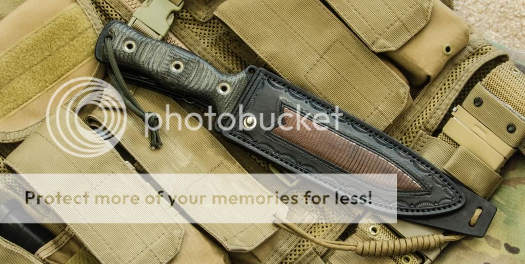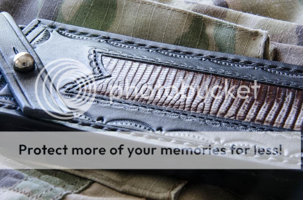 Black leather with brown Lizard inlay (everyone is out of zombie skin), raised to fit flush with top of leather. I used a Sam Browne stud on the front of this one instead of a snap for the removable retention strap, gives it a little classier look. Has beeswax finish so it's ready for the outdoors!