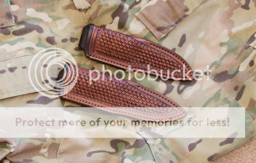 Brown, with basketweave tooling. These have laquer finish. Top is the bushraptor, bottom is the bushfinger.