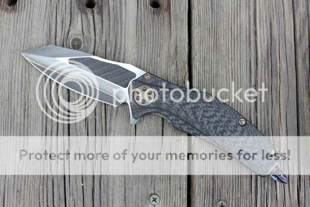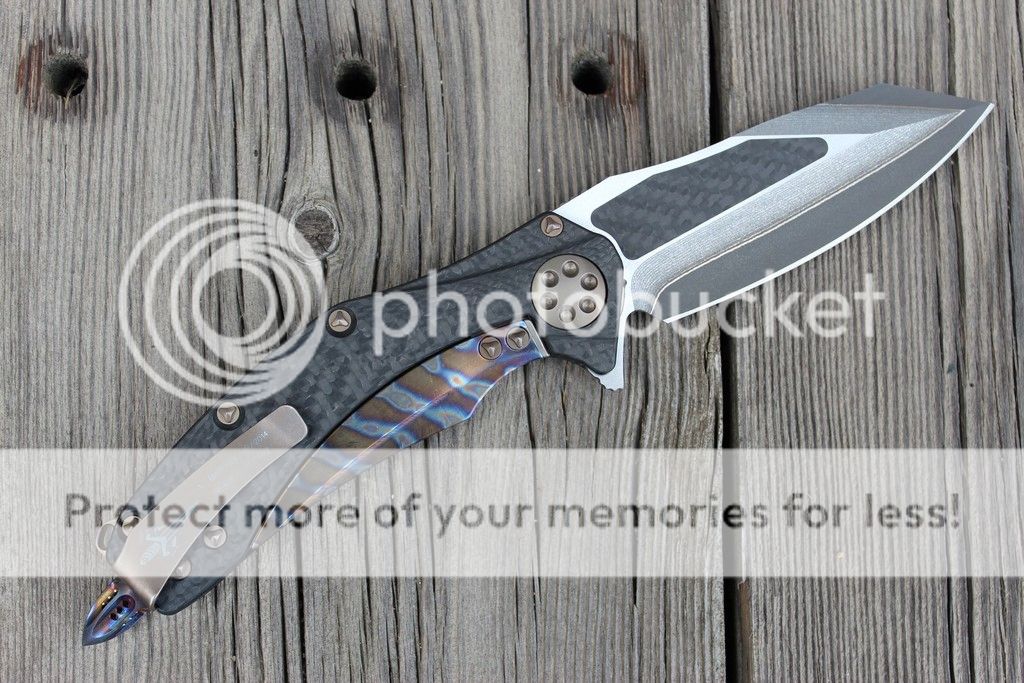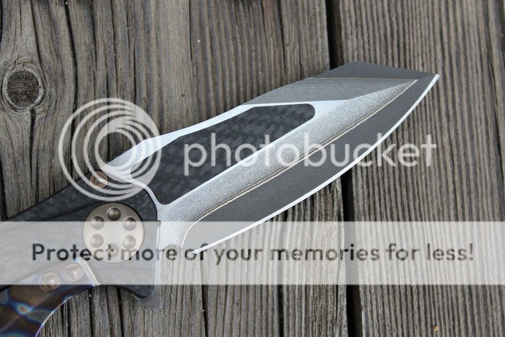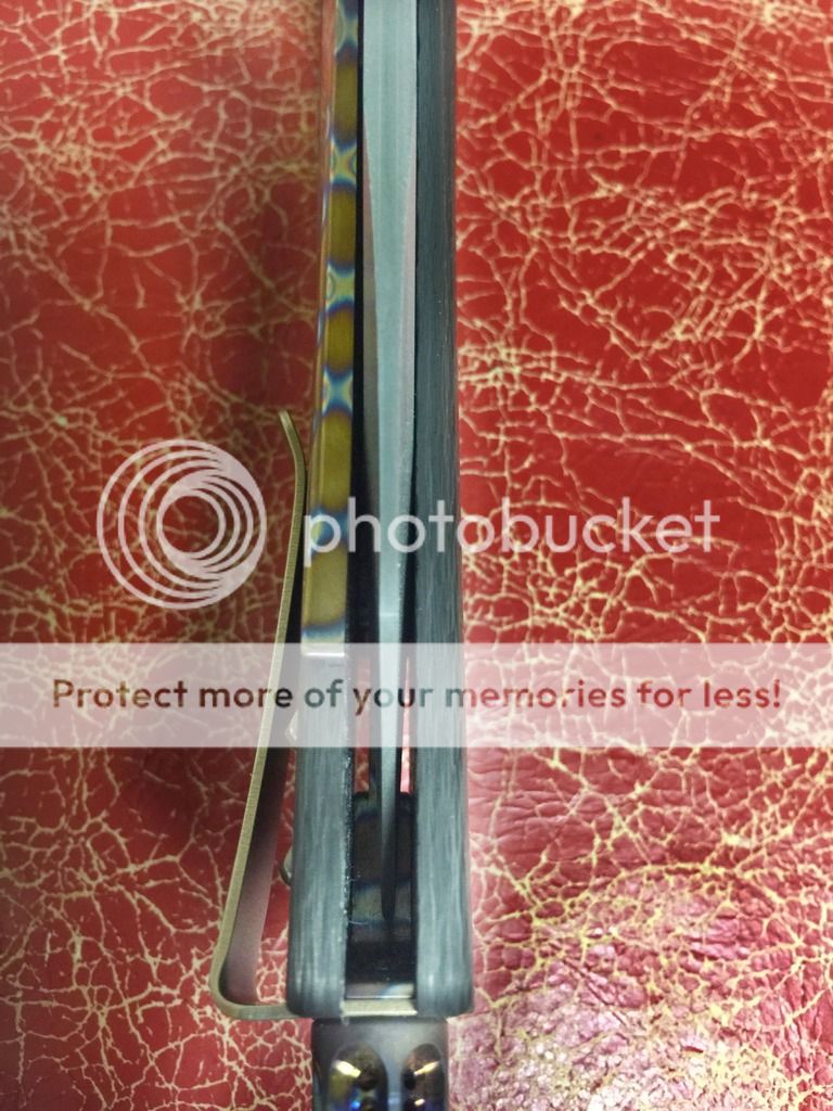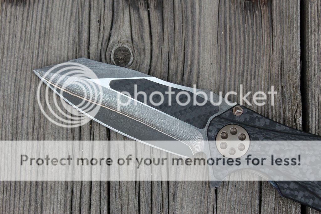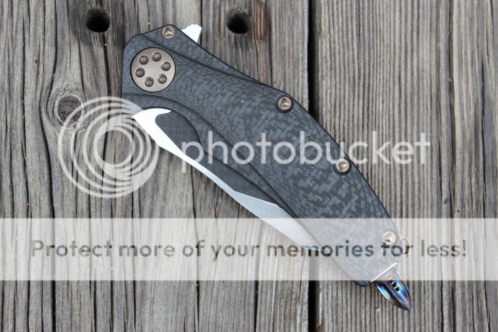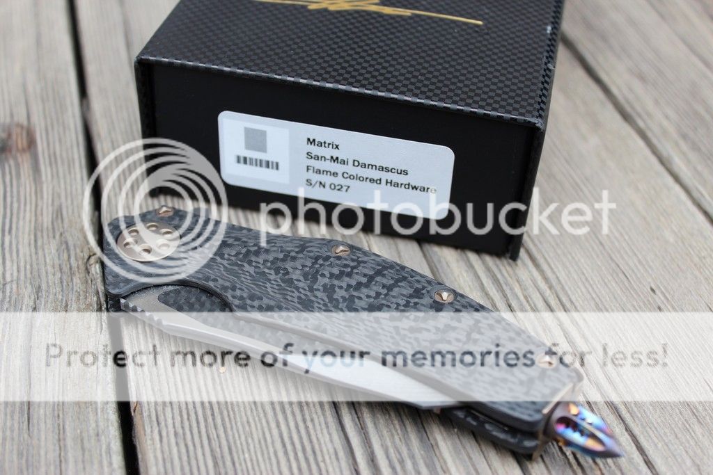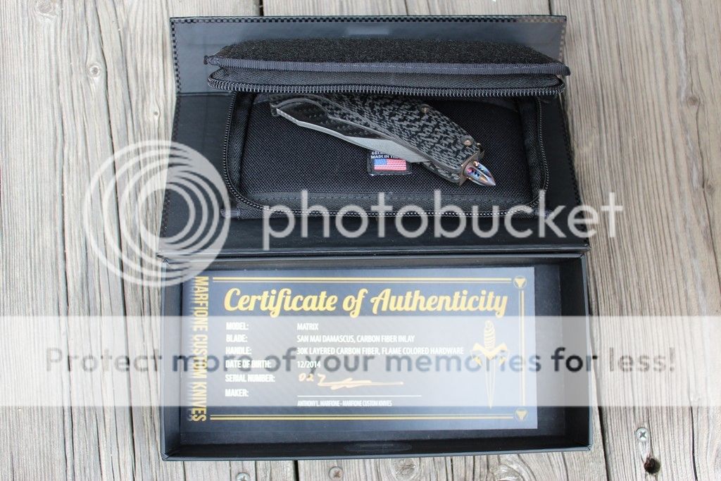 Hey Guys! Up for sale is a beautiful, like-new Marfione custom matrix. It has bronzed screws, clip, and pivot. Titanium flamed backspacer, lockbar, and skull-crusher. Scales are carbon fiber. Blade is a beautiful san-mai blade with a carbon fiber insert. It's a fantastic flipper, solid lock up, super smooth. Comes with box, authenticity card, and zippered pouch with a spot for a velcro patch. The only flaws: The blade is just ever so slightly off centered when closed, see photos. And there are some light machine marks visible under the flamed Ti on the lockbar. Both pretty minor stuff! Asking $TRADED$ OBRO shipped in the US, PayPal'd. A custom Matrix with this many upgrades usually sell for $1,500 plus new. I would consider a partial trade towards a Microtech (non-custom) Ultratech OTF, Scarab, Makora, or Combat Troodon OTF. I like the more unique configurations (frag or tri grip handles, camo patterns, carbon fiber, clear tops, etc). Thanks for looking, and hit me up if you have any questions.
