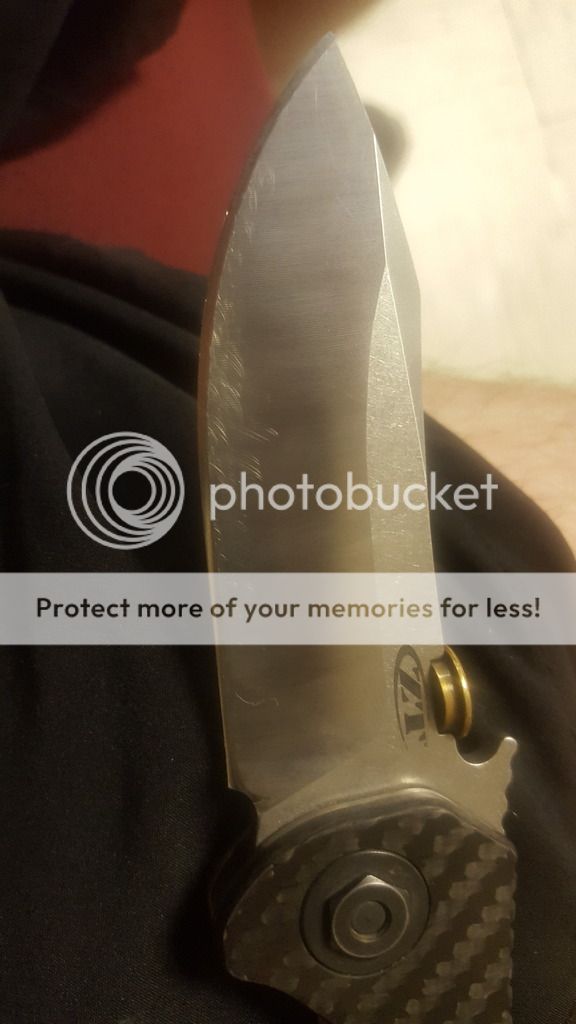 I have a used but not abused zt 0630 custom that I would like to sell. Been a great knife just looking g for something different now. It has a custom carbon fiber scale, anodized titanium screws and a 45 auto thumb stub. As you can see in the pics the blade has some wear but is sharp as a razor. Also the blade rides to the scale side but doesn't rub at all.