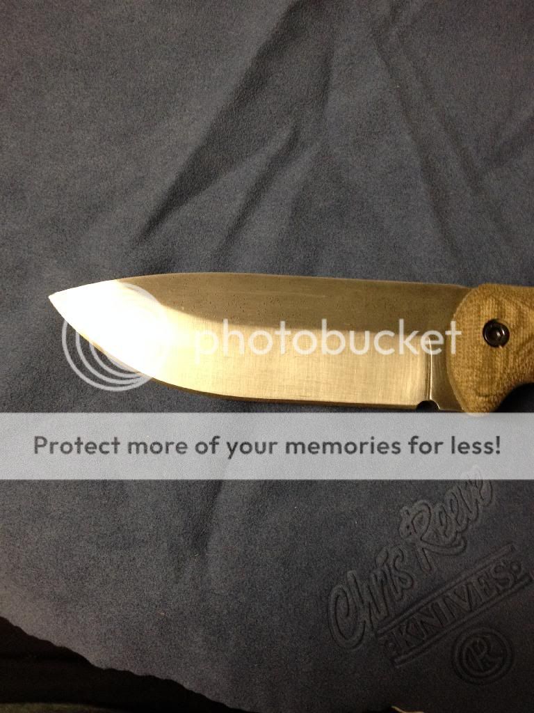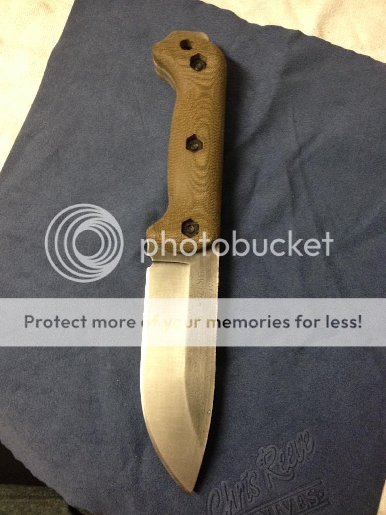 User Becker bk2. Has custom work done to spine along the length of the handle. Tan micarta grips. Tech lock. Has had black stripped off and then acid etched, spine and grind have been scotch brighted to give it contrast.*Comes with box and papers
