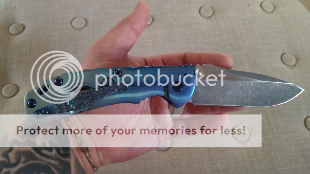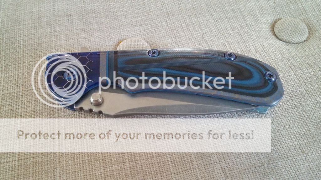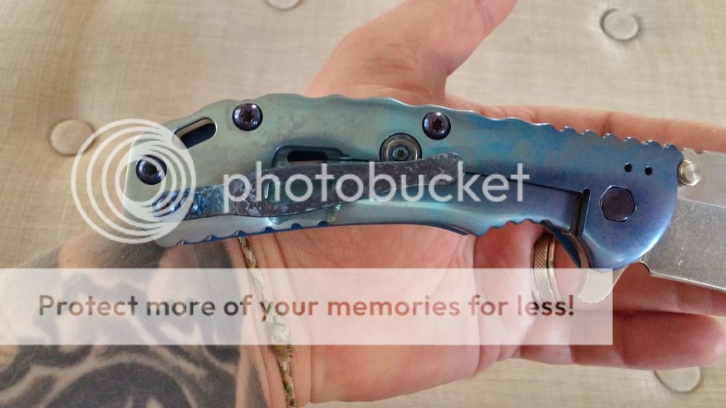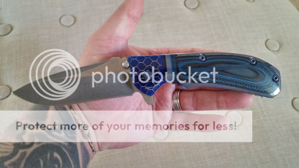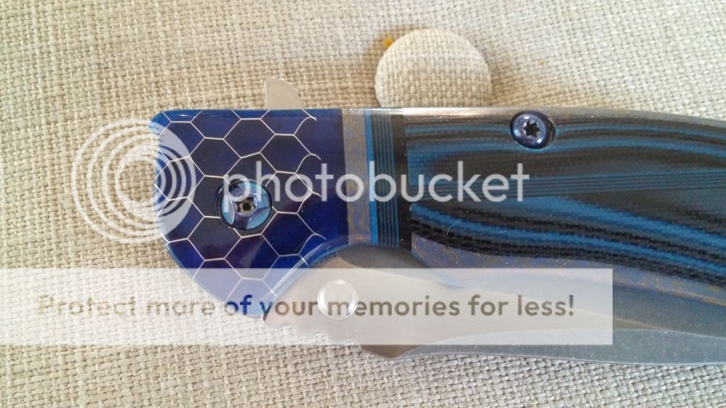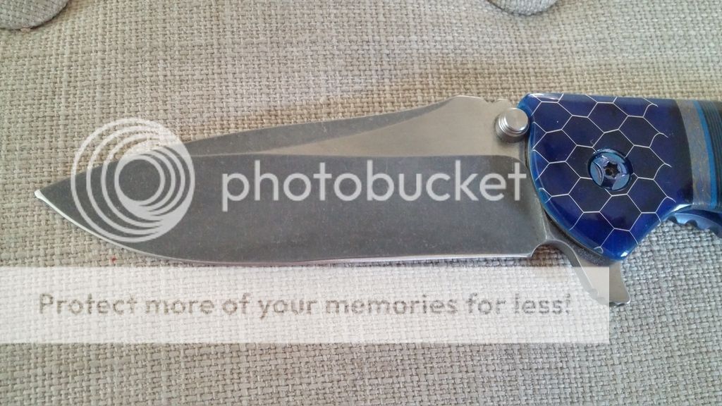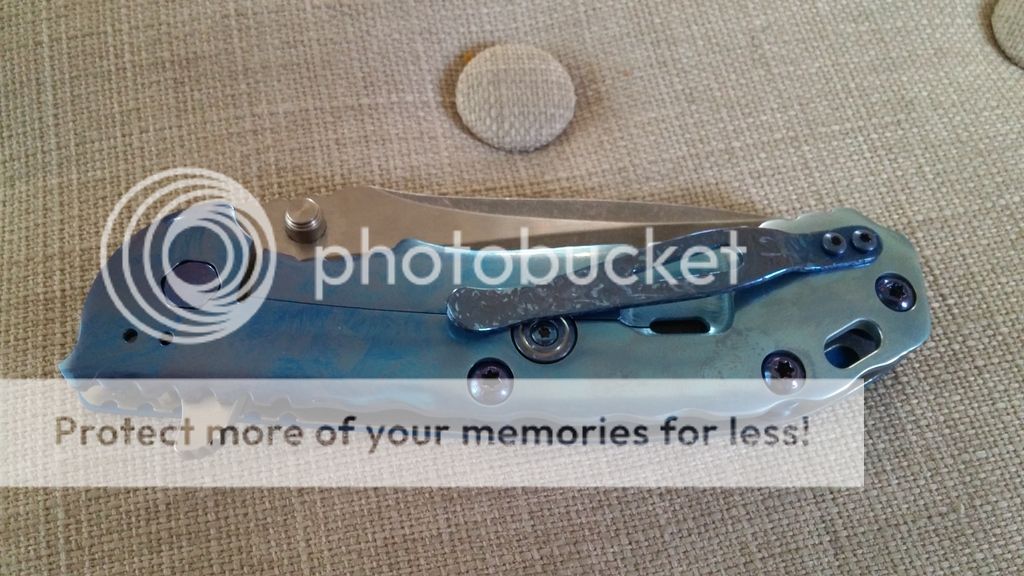 Custom Scale (M3 , Home made Honey comb bolster, Blue and black G-10), Full Ti-Hardware and pocket clip , Ice Jeweling, Lockside ground smooth and buffed, Lockside top edge random profiling. Blade Reground hollow grind, Acid/Stonewashed satin flat. Anodized dark blue and Gradient blue to light gold Lockside. Right hand carry only. Solid lock up, No play, no lock stick ( carbidized), No Lock rock, Centers. Flips well from tab and thumbstud.