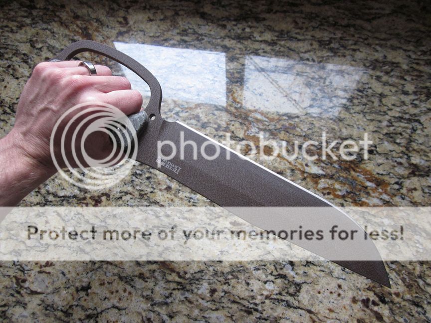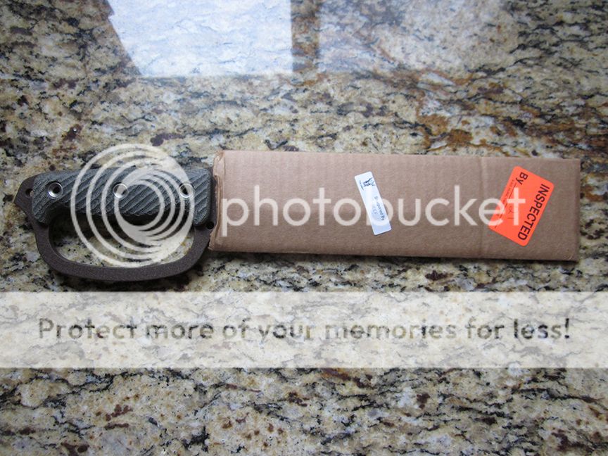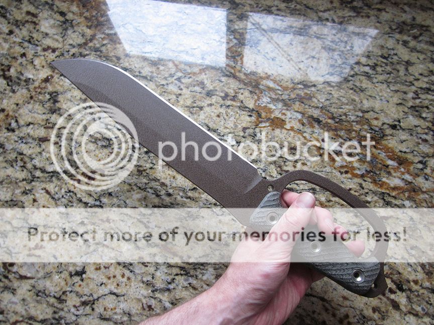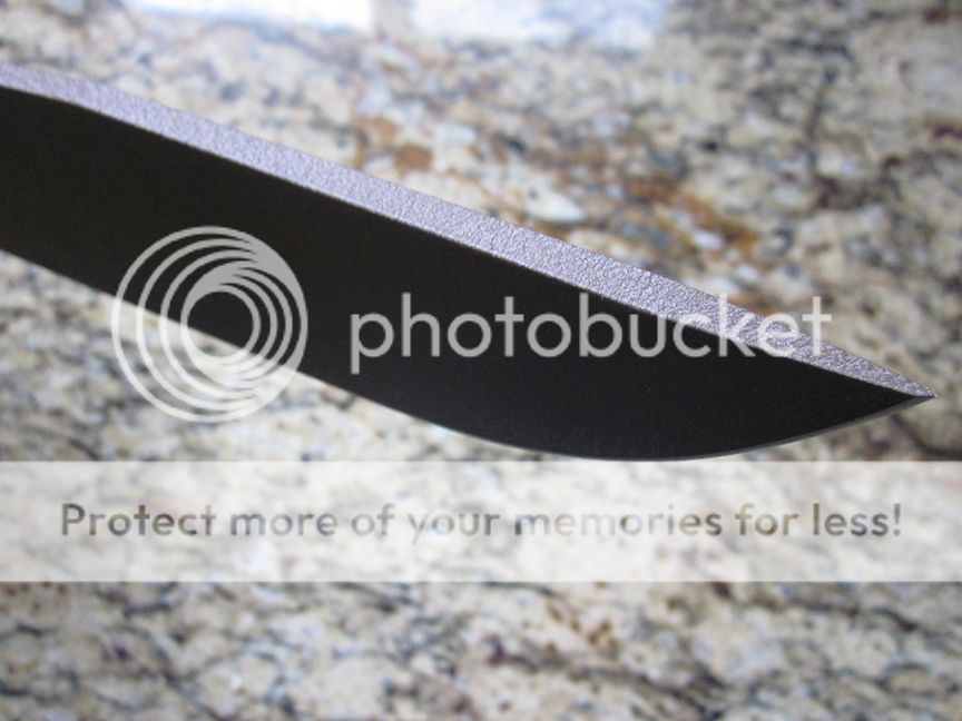 Swedgeless version with muddy coating and black micarta handles. Handled but unused. Has white traces on the blade from the cardboard sheath, but this can be cleaned off.