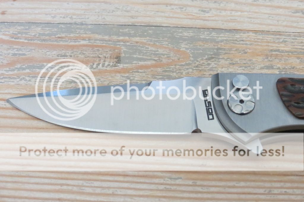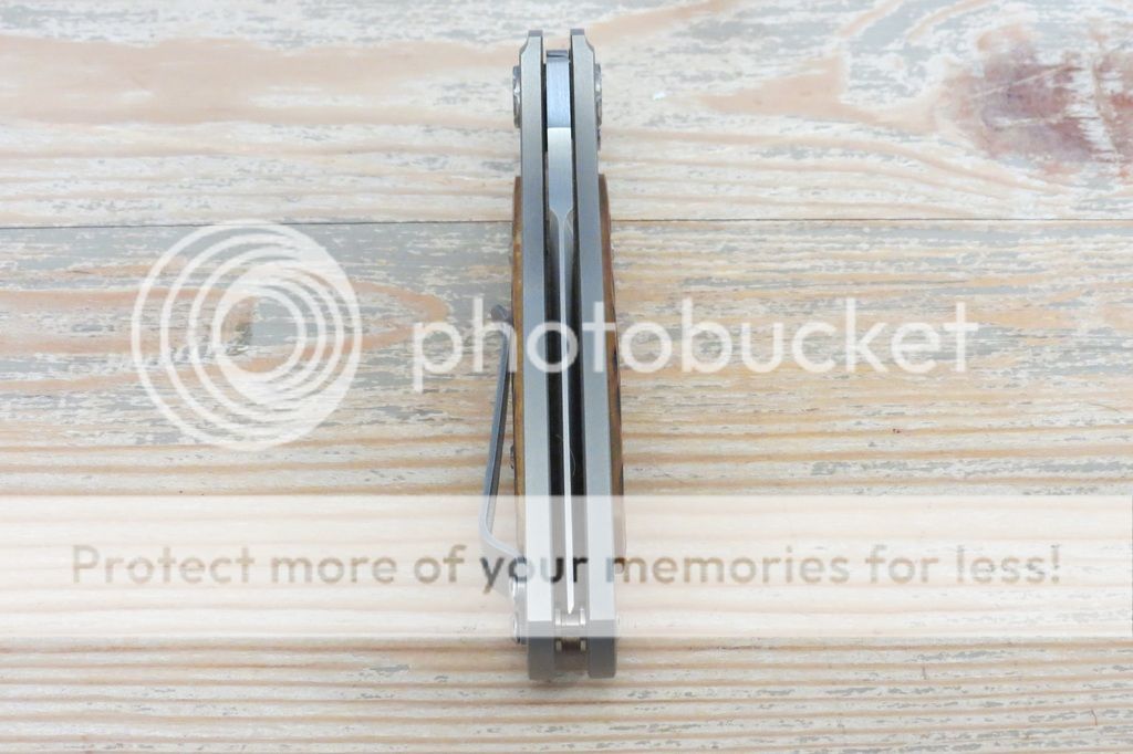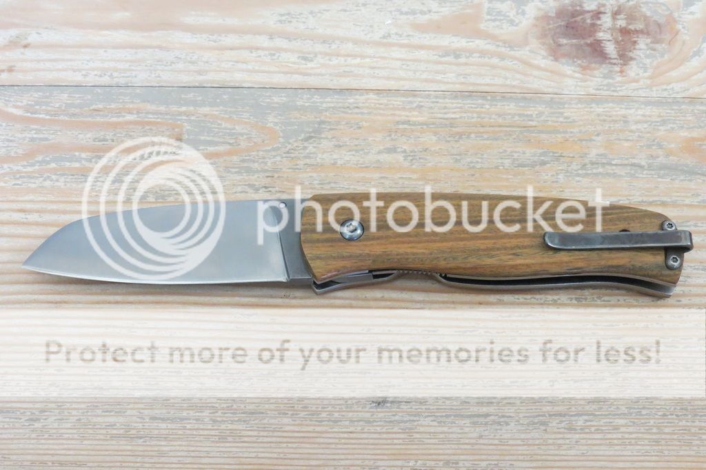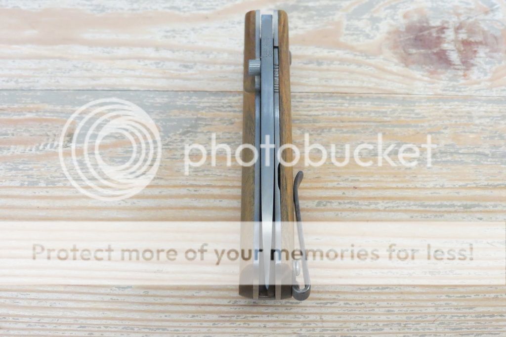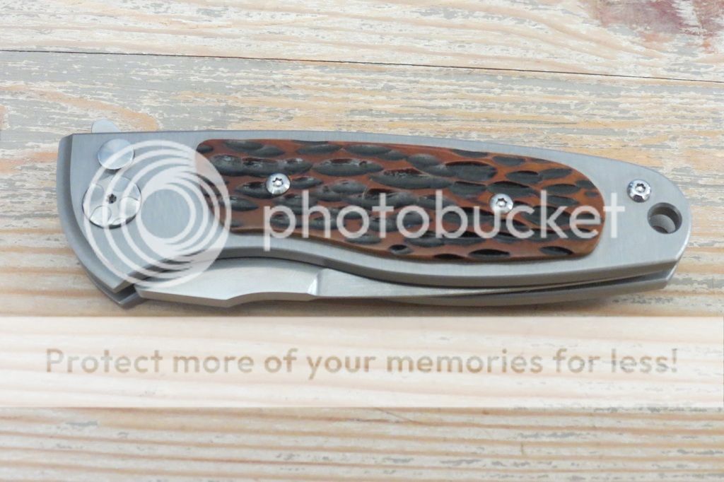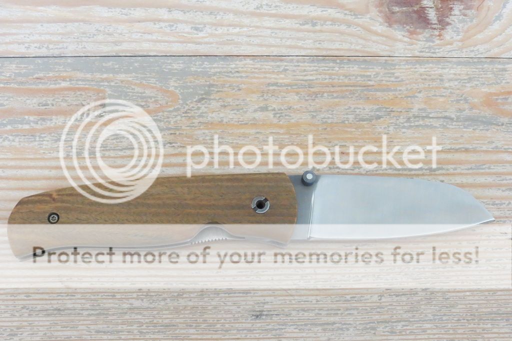 Notes: Bought new from maker and have carried it once or twice. S35VN Sheepsfoot style blade (full flat grind, approx 3" cutting edge and 7" total length), lignum scales, Ti liners. The backspacer, clip, blade, and screws have a bit of acid etching. The overall construction is solid and the knife feels great in the hand. Good early lock up and centered blade. No blade play at all.