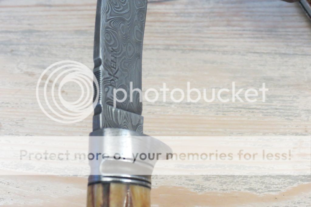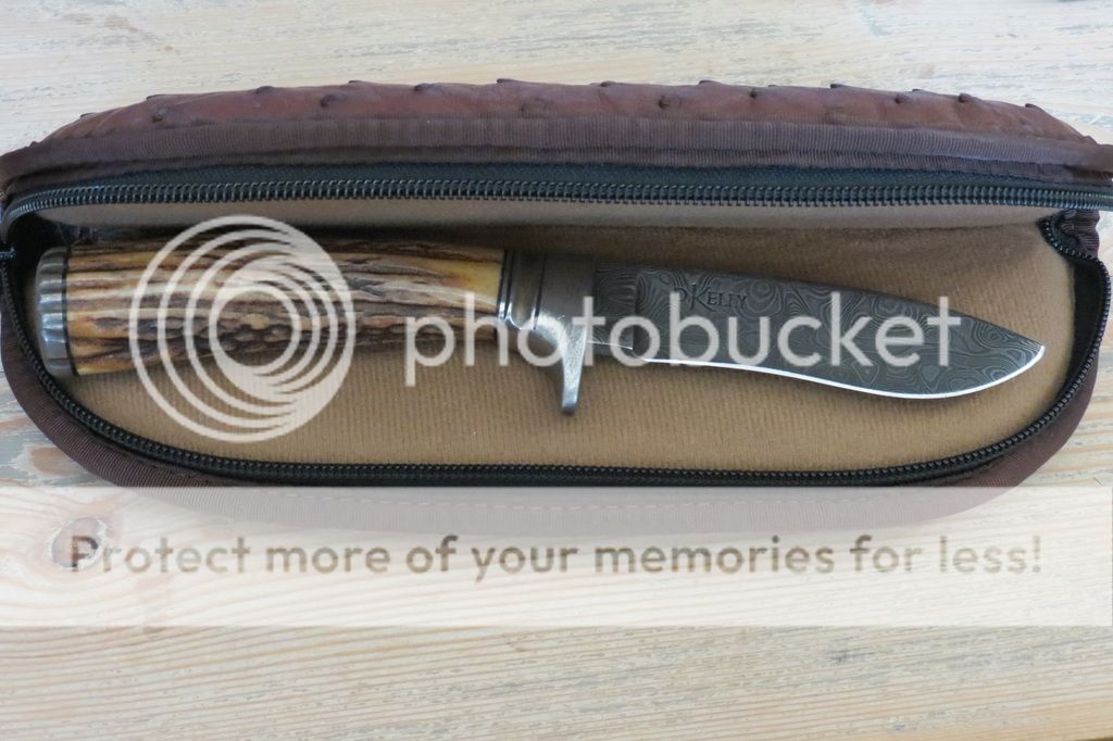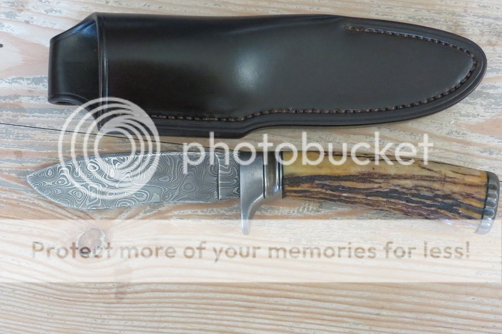 Notes: Bought on forum. Time worn burnt Sambar stag; milled wrought iron guard with fluted ferrule and matching butt cap; 4 1/8" 1084/15N20 Carbon Damascus hollow ground blade; overall length of 9"; the maker's leather sheath; and padded leather zipper case.