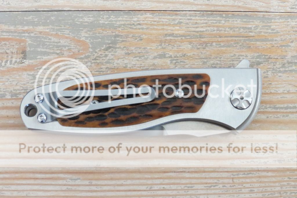Notes: Bought new from Blade HQ. RWL-34 spear point blade (hollow grind, approx 3" cutting edge and 7" total length). Amazingly smooth flipping action, centered blade, solid lock up, blade falls when button pushed to close. Really impressive flipper and the jigged bone is not something you see often on a custom flipper. The only thing that is not perfect is the grind at the tip of the blade (see photo). I should have a zipper case for this.