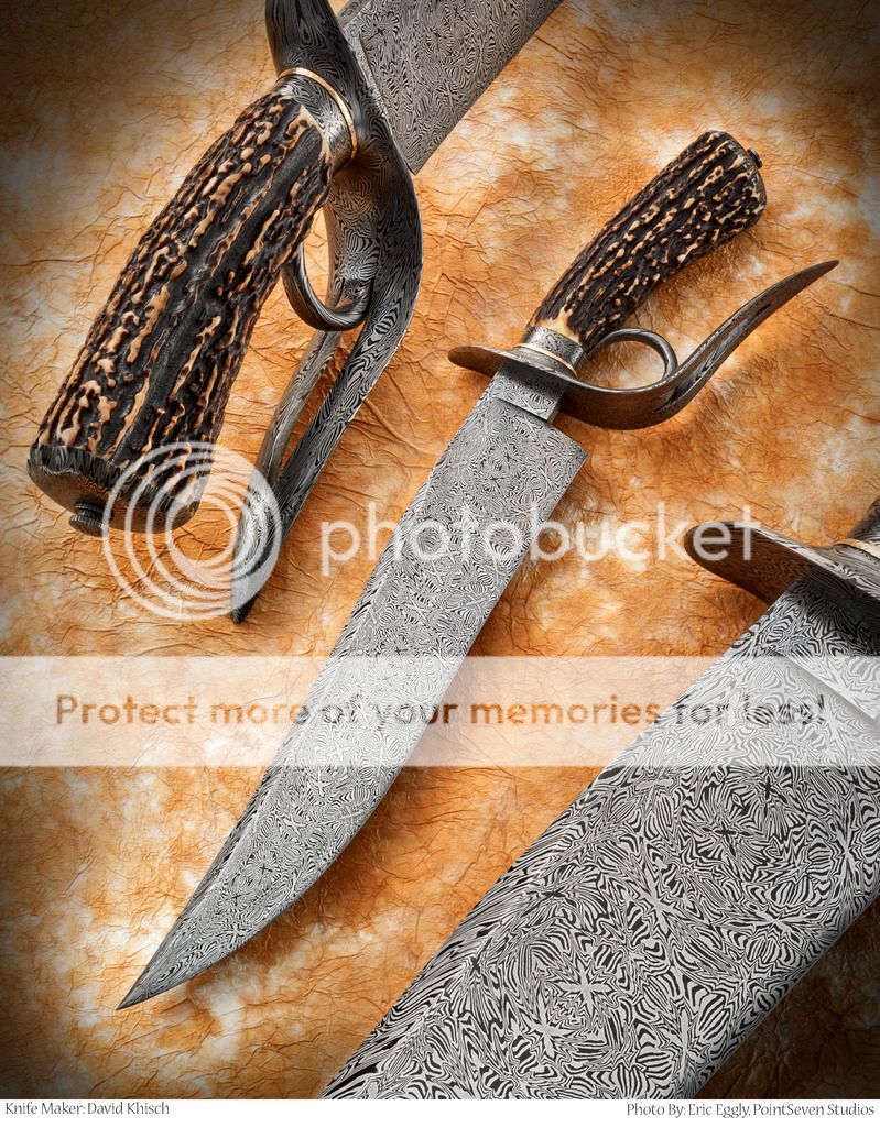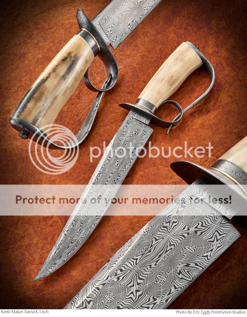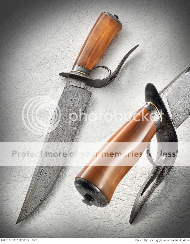 Hi Folks I wanted to show the photos that Eric from Point Seven took of my knives at ICCE. these knives sold at the show so they are not available. the stag split ring won best damascus and the Moran Memorial Damascus Award the walrus split ring won best fixed blade. I put my new design the pierced ring D in best bowie But Harvey Dean show up with very nice feather penny guard with some very nice engraving on it congrats Harvey well deserved. a bigThanks to all the folks that gave my knives a vote. I did not chime in on some of the other threads about this show I am hoping this show takes off it is a really fun place to have a show and a real great chance to meet new folks. yes the crowd was a little light but folks did sell knives. I believe they will do better on getting folks in the door next year there is a lot on the line for both groups and I believe this will be a very good show in time but we need the collectors to get on board and see what a great time this show can be.