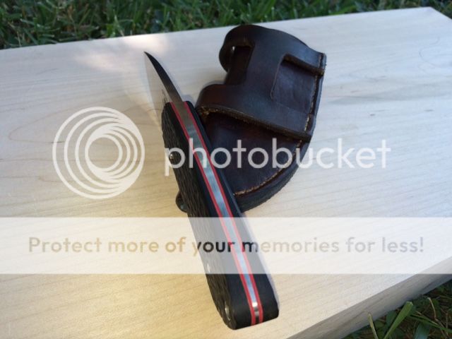 I bought this and truly love the look and feel of the knife but no longer use it so it must move on. I carried it a little and there are a couple slices in the sheath which can be seen in the photos.