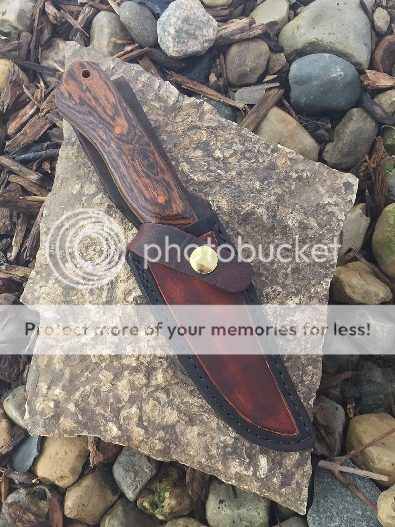 I am re-posting this Clip Point Hunter tonight. I am really happy with this knife, it feels great in the hand and is super sharp. I made it with D2 from Aldo. The handle has nicely figured Bocote with natural micarta liners and green G10 pin stripes. I am including a different sheath than the first time I posted this knife.