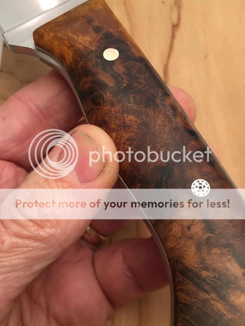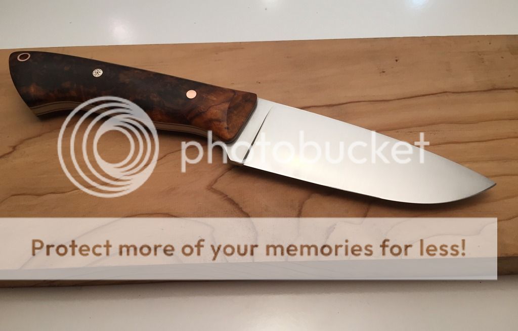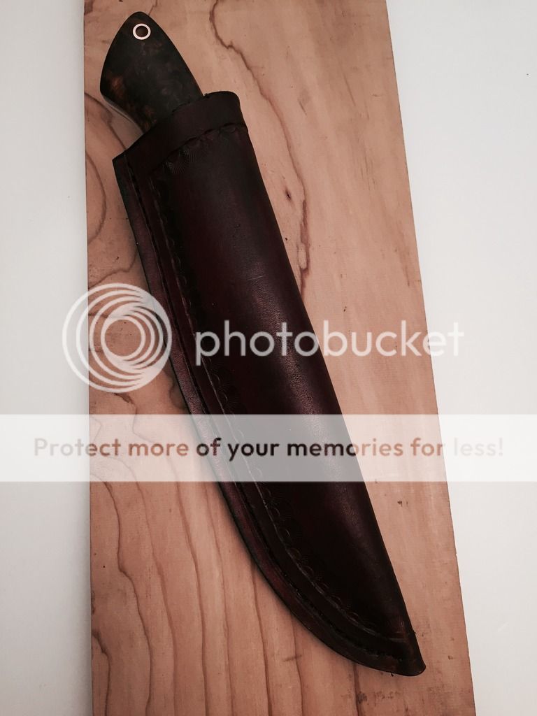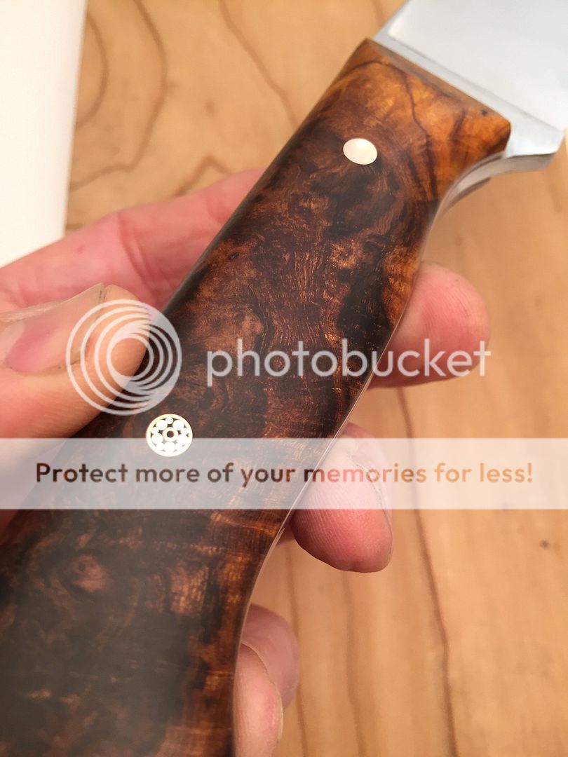 I've got another D2 hunter up for grabs tonight. It's D2 steel that was heat treated by Peter's to RC60. It is satin finished with a 400 grit cork belt. The handle material is some of the nicest Arizona Desert Ironwood Burl I've seen. The liners are natural micarta and it has white G10 pin stripes. The hardware is copper with a copper mosaic in the middle. The sheath is hand tooled and dyed leather.