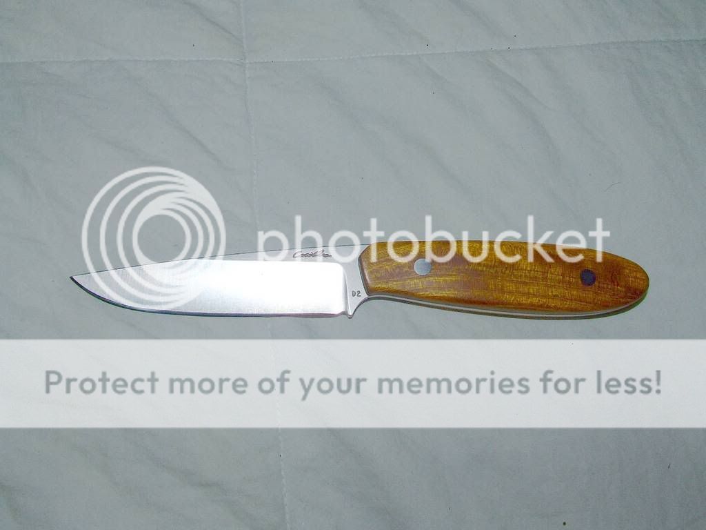 For the way I process a deer I need something with moderate length, a narrow tip with a good belly at the very end. The handle needs to allow me to put the bottom into the palm of my hand and extend the blade out like an addition to my index finger. D2 doesn't rust much and holds up to hide and a thin hollow grind makes shallow cuts in flesh better than anything. I never dangle a *sharp* knife off my wrist or anything else, so a lanyard hole is of no use to me, I just set it down next to the bone saw on a table. I need a decent index finger indent or a guard, because hands get slippery, and I like my skinner sharp like a scalpel. Those requirements drove this design.