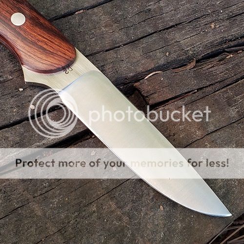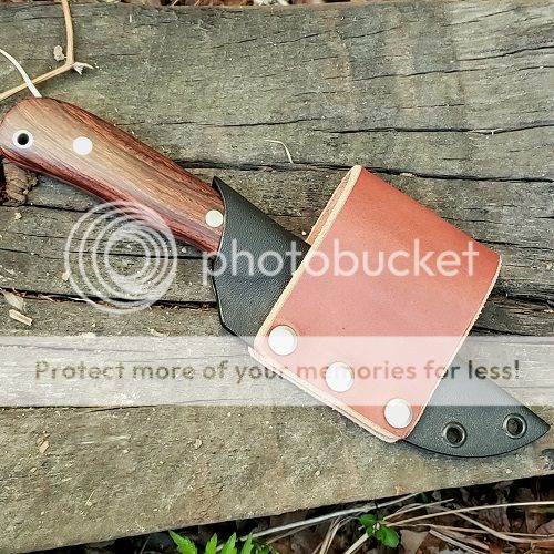 Still new to the forum, and this is the first item I am putting for sale! For sale is a drop point knife. Knife is flat ground with a tapered tang. The handle is desert ironwood with a red spacer, and it is epoxied with corby bolts. I also made the sheath out of kydex, with a leather belt loop for side carry. Blade also has my initials "AKS" etched on one side, and the blade material "D2" stamped on the other.