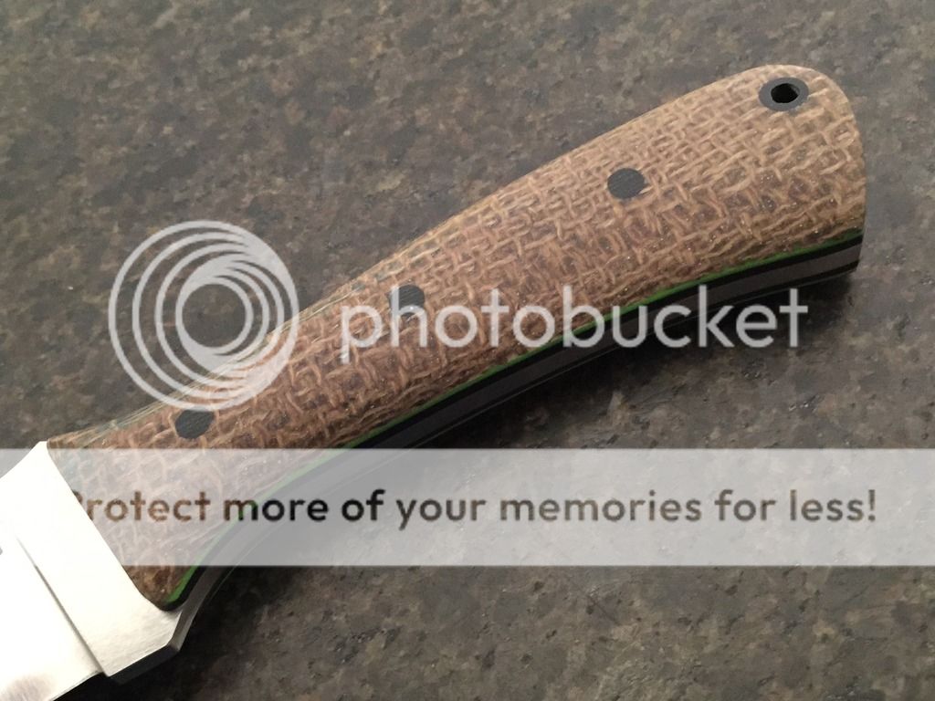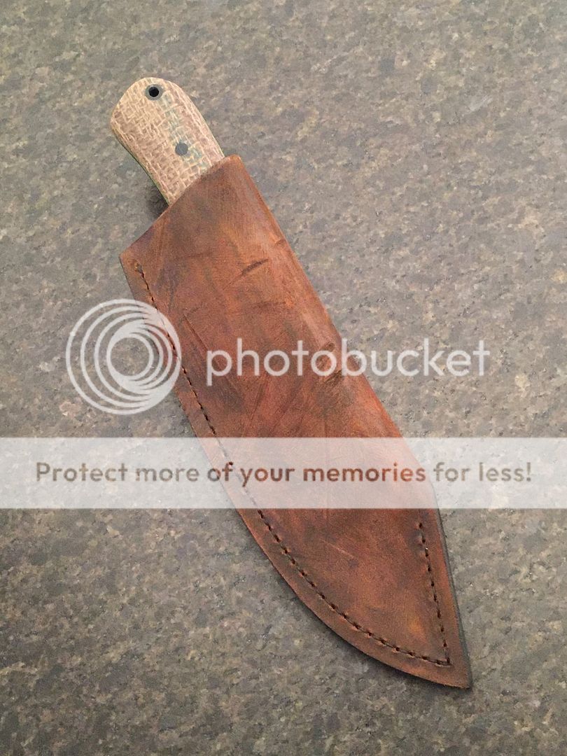 Tonight I'm offering up a Nessmuk hunter that is patterned off of Andy Roy's version. (with permission) I love his rendition and he has been a huge inspiration to me as a knife maker. So I guess you could call this a tribute knife. It wouldn't be complete without the Shadetree phenolic handles. This one has coffee bag with black and lime G10 liners. With the blade being D2 it should be a tough knife so I paired it with a rugged distressed leather sheath.