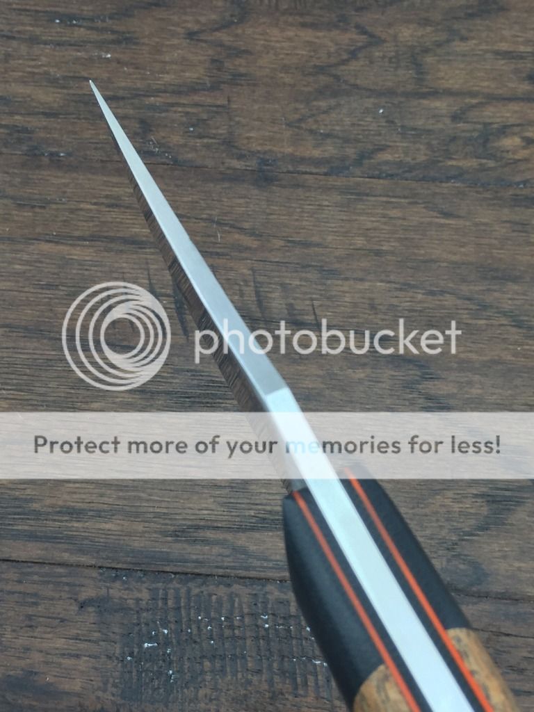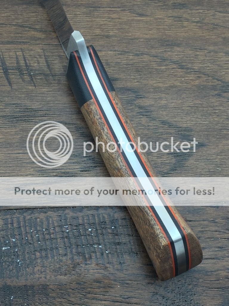 I've got a trailing point skinner up for sale tonight. The blade is D2 and the handle is Black Mesquite with Black Canvas Micarta bolsters and pins. The liners are black canvas micarta and orange G10 and the lanyard tube is carbon fiber. It has a small subtle mosaic pin in the center.