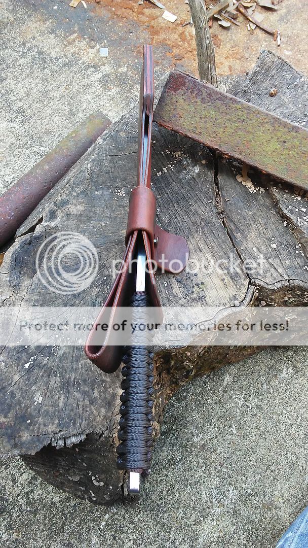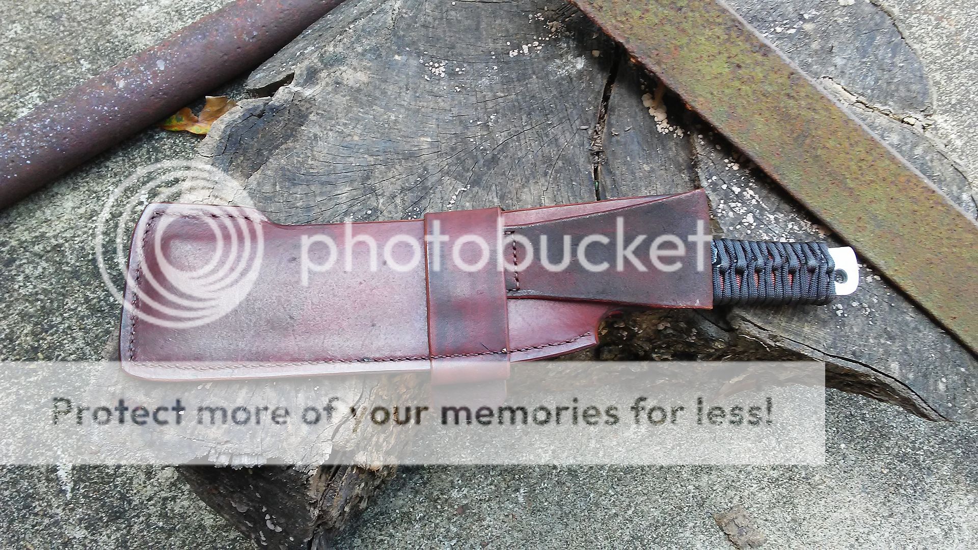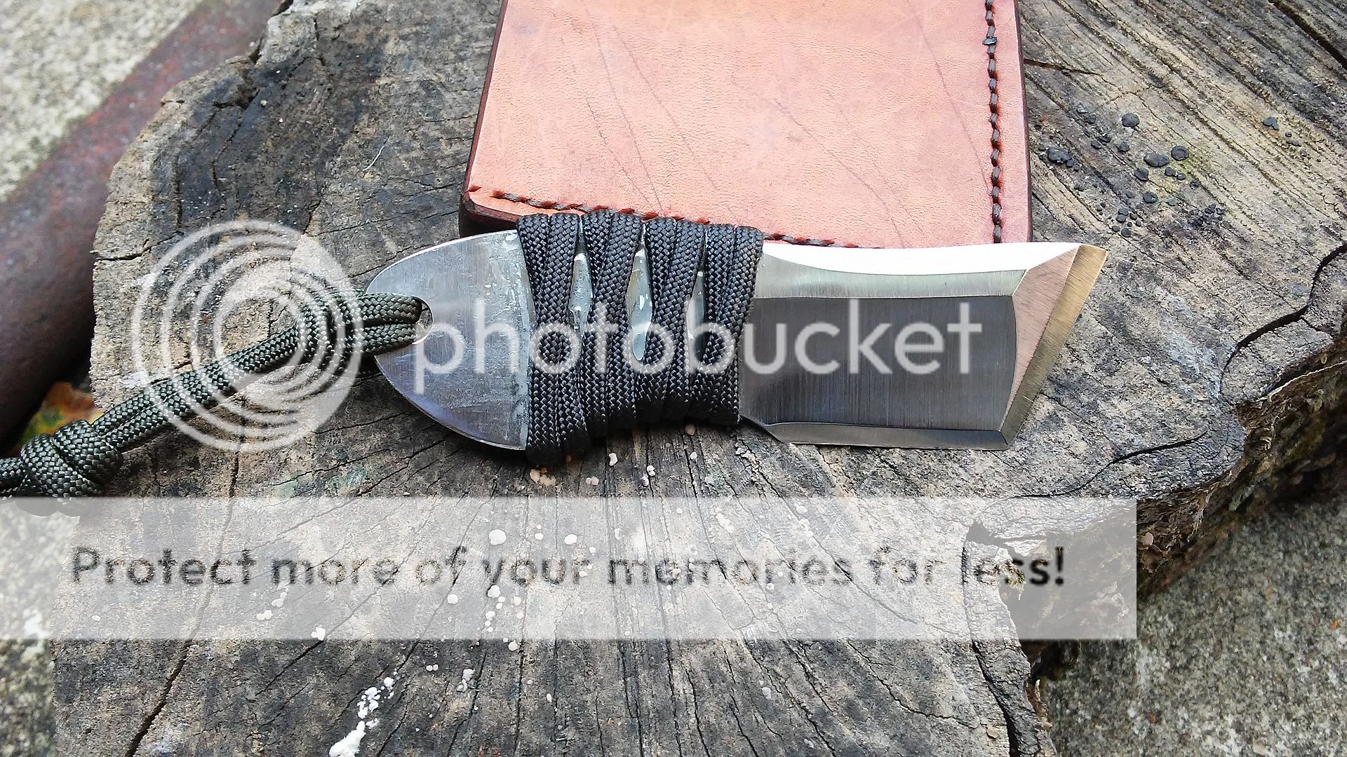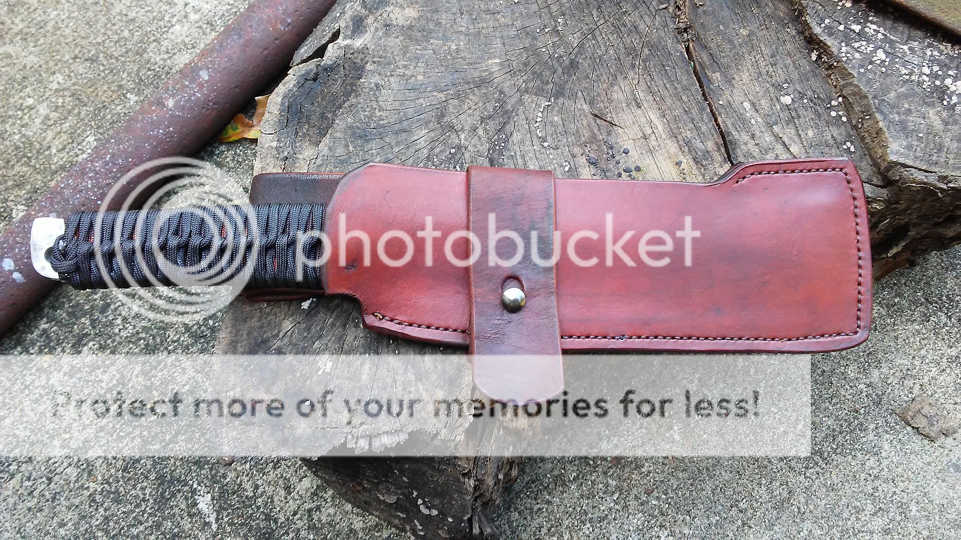 Next up is the chopper. It is made from 1095 carbon steel heat treated to be 59-60RC. The blade is ground with a double flat grind. The finish on the blade is a stain hand finish, so need to worry about messing up a nice polished blade. This thing is made to be worked. The handle has an under wrap of red cord with an over wrap of black paracord that was soaked with resin. It comes with a very nice handmade leather sheath.