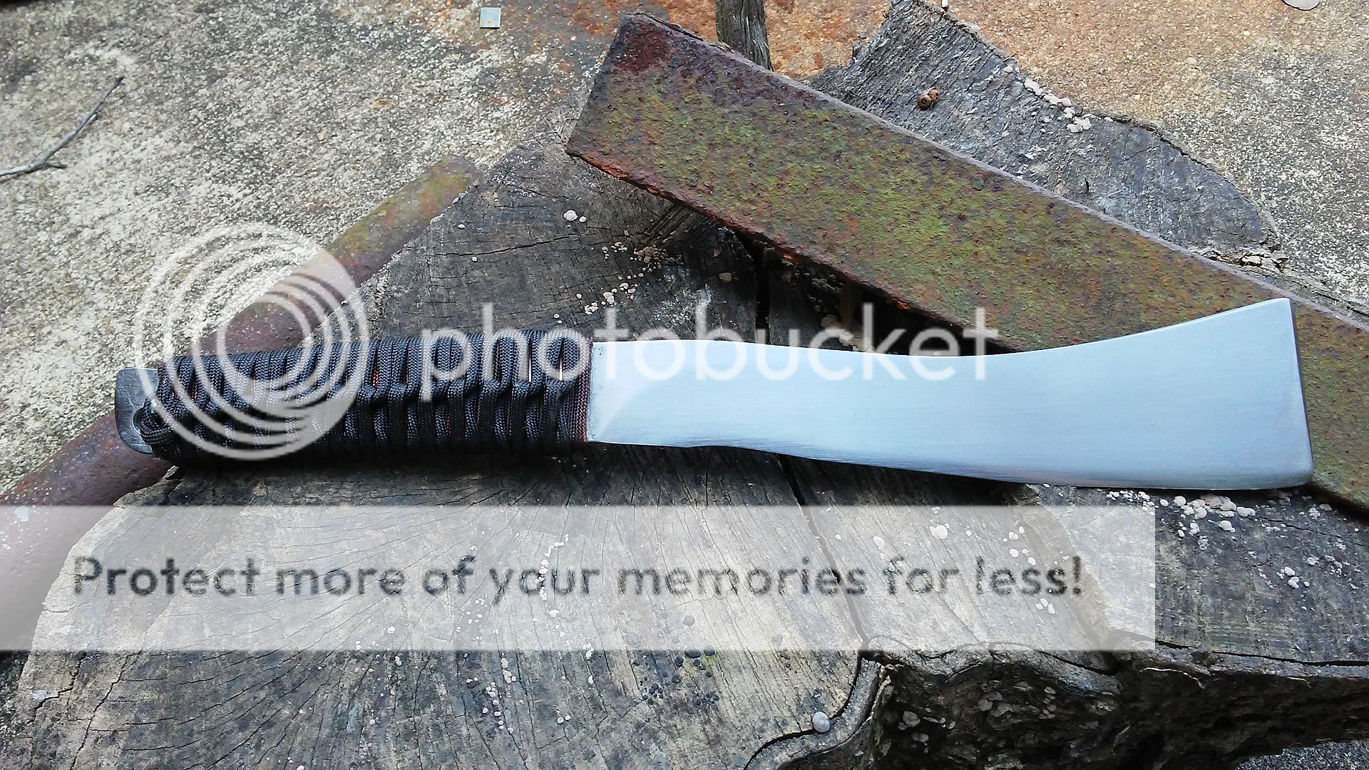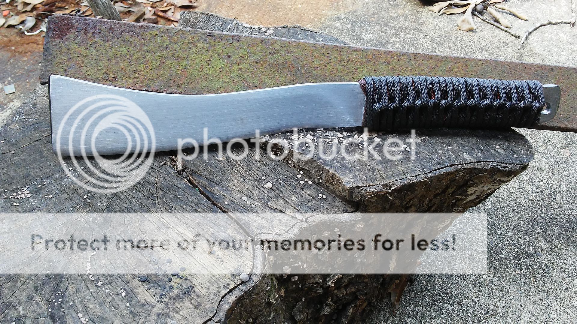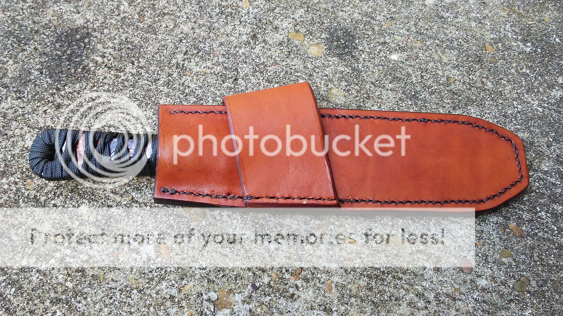 Next up is the chopper. It is made from 1095 carbon steel heat treated to be 59-60RC. The blade is ground with a double flat grind. The finish on the blade is a stain hand finish, so need to worry about messing up a nice polished blade. This thing is made to be worked. The handle has an under wrap of red cord with an over wrap of black paracord that was soaked with resin. It comes with a very nice handmade leather sheath.