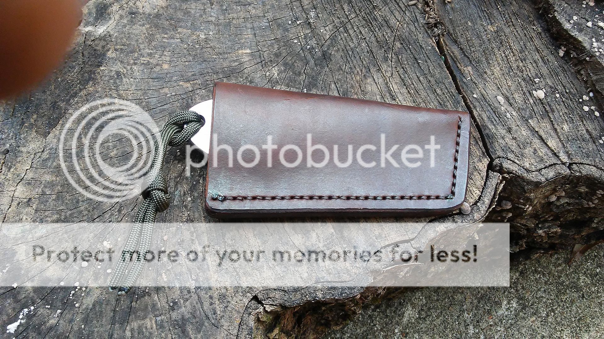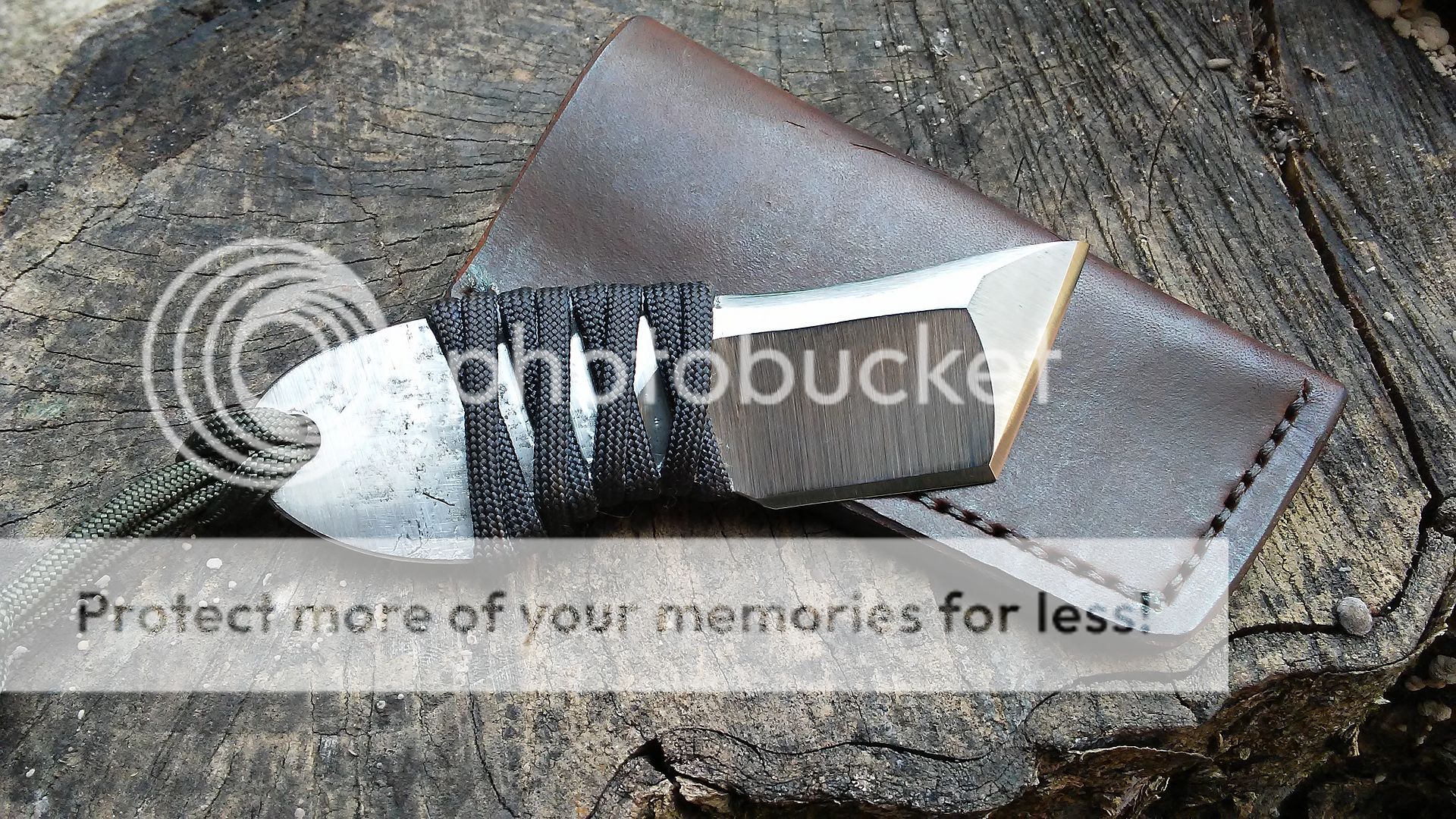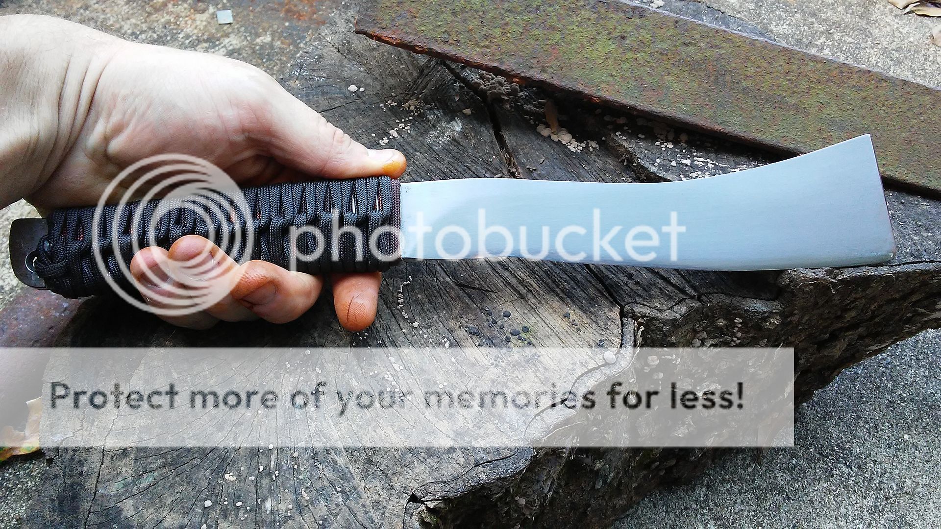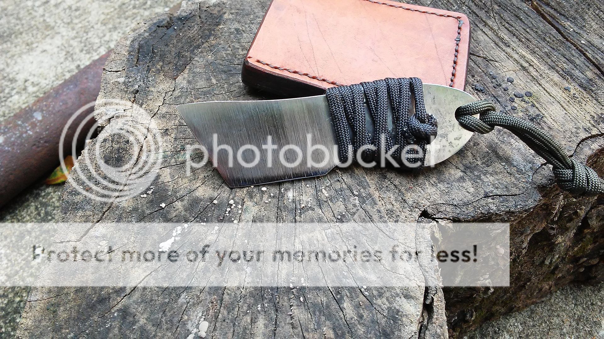 Next up is the chopper. It is made from 1095 carbon steel heat treated to be 59-60RC. The blade is ground with a double flat grind. The finish on the blade is a stain hand finish, so need to worry about messing up a nice polished blade. This thing is made to be worked. The handle has an under wrap of red cord with an over wrap of black paracord that was soaked with resin. It comes with a very nice handmade leather sheath.