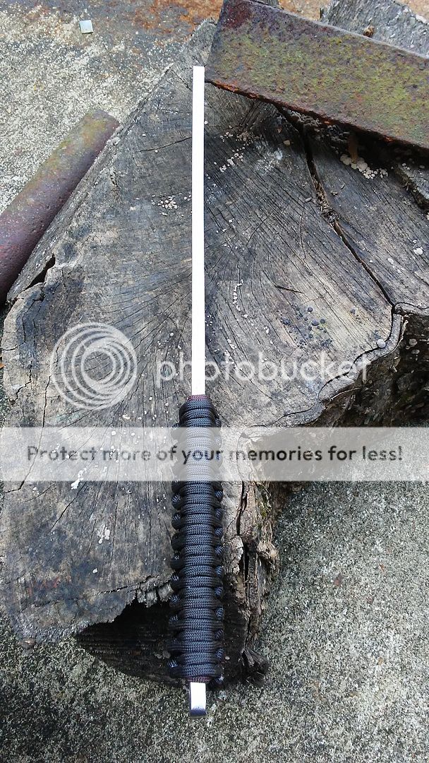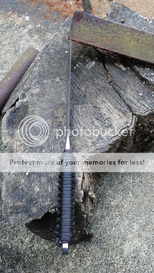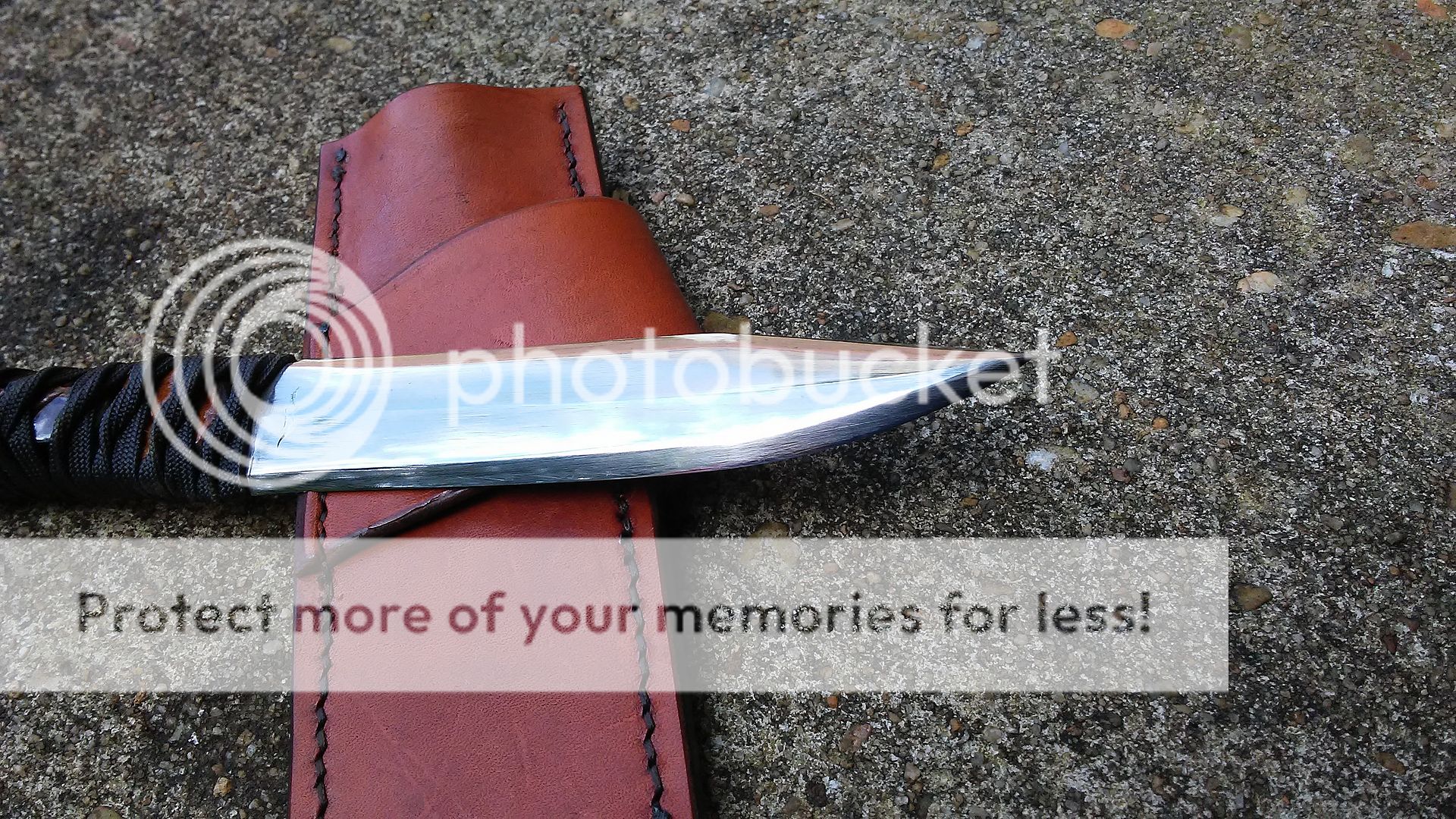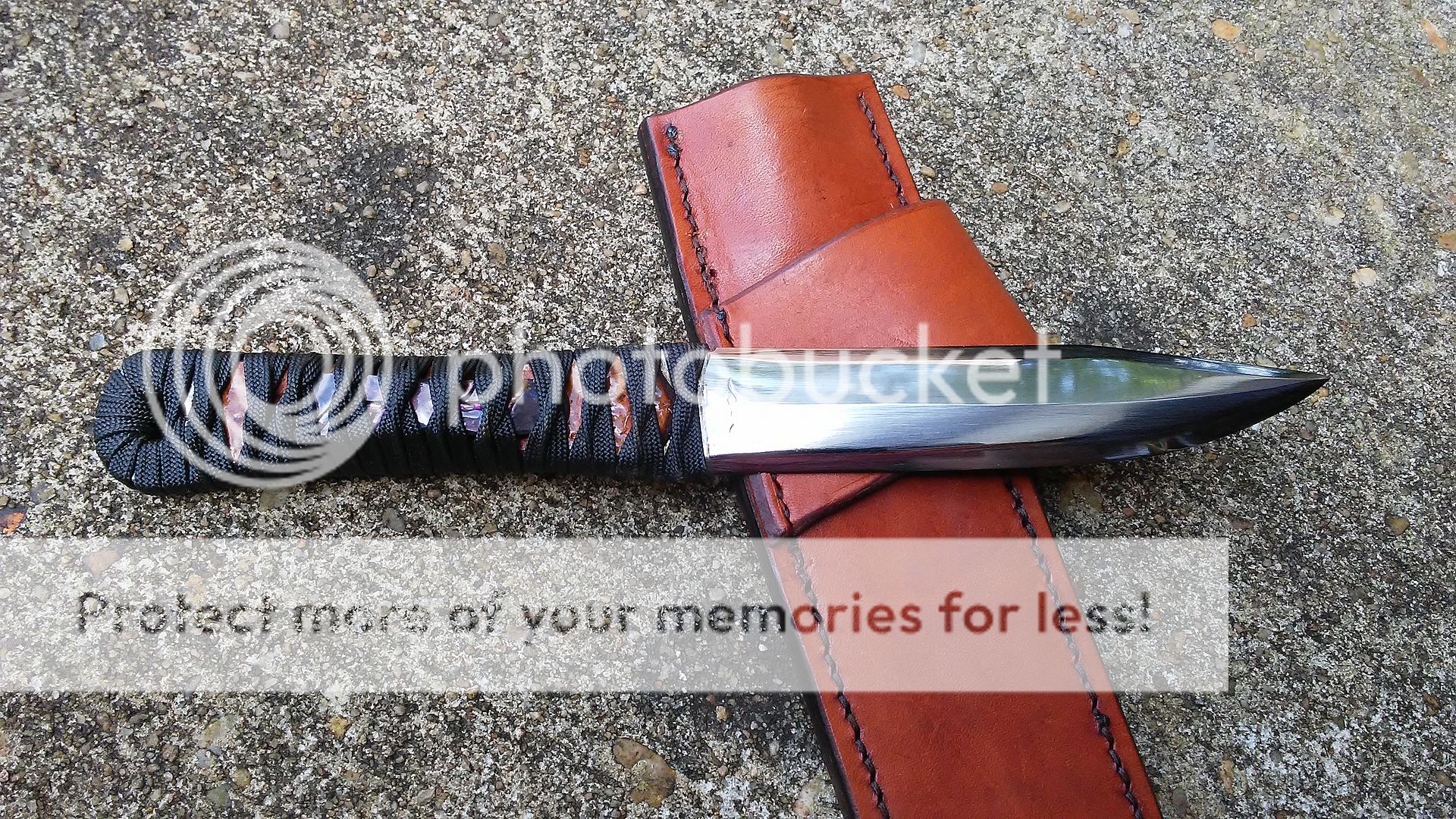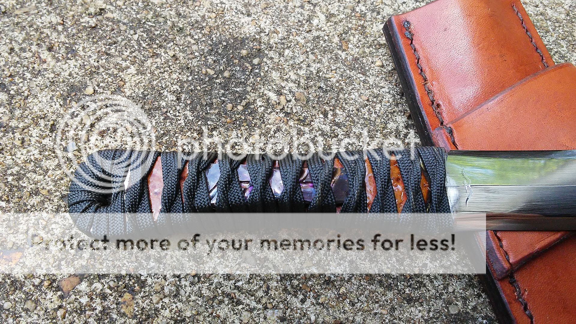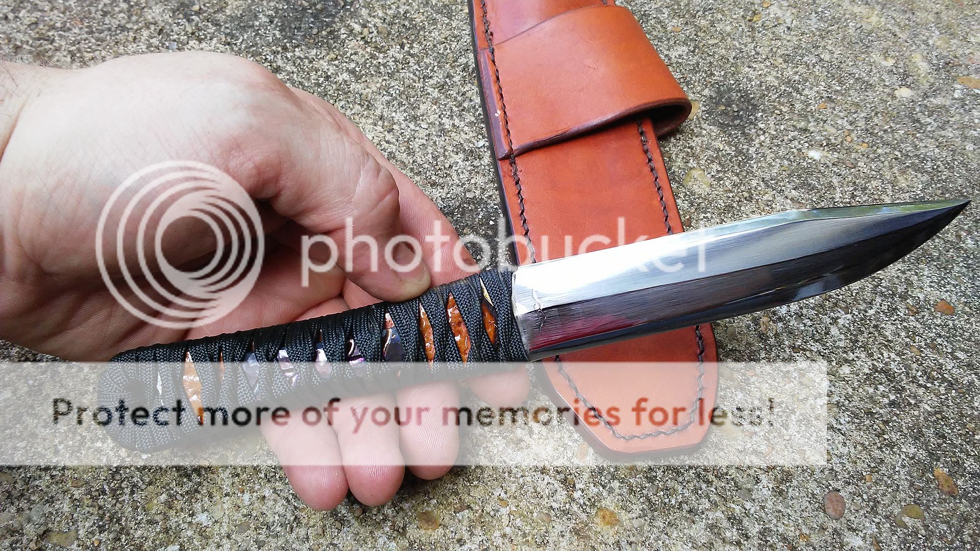 Up first the dagger. It's made from 1095 carbon steel that has been heat treated to be 59-60RC in hardness. The blade is ground with a double right side chisel grind. It is sharp on top and bottom. The handle has leather panels that is over wrapped with black paracord. The menuki is made from titanium. It comes with a leather cross draw sheath.