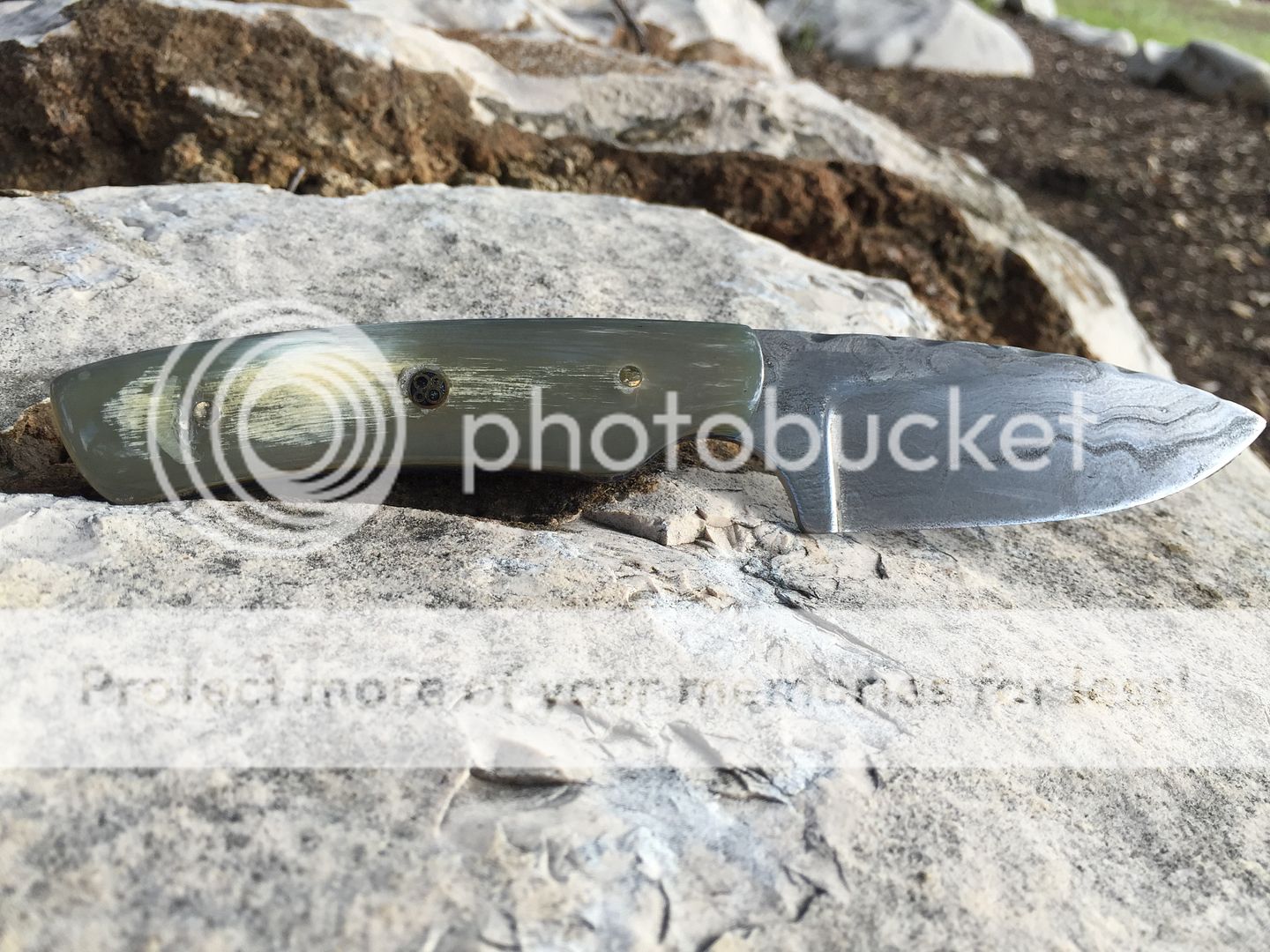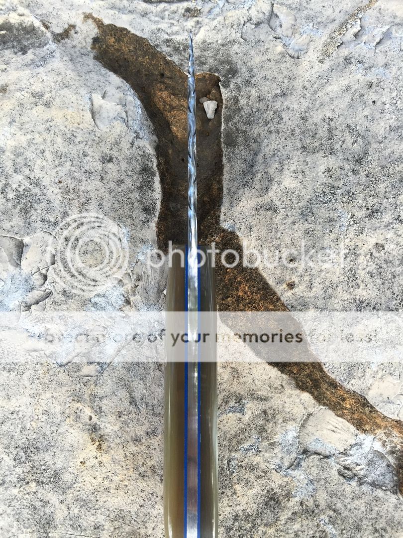 Fresh off the Grinder... Random pattern Damascus drop point in polished sheep horn scales and blue liners. Vine file work along the edges spine.