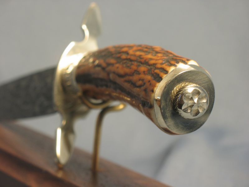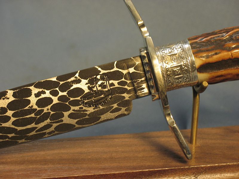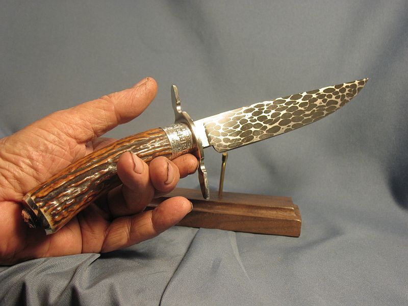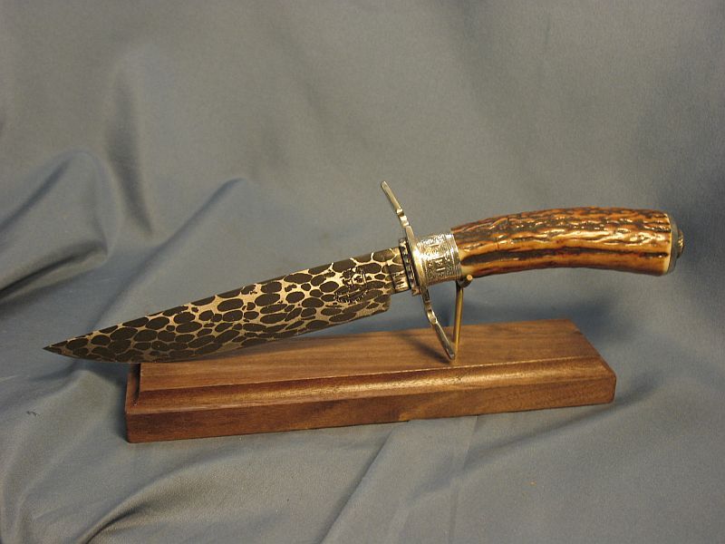 Nice Bowie or fighter with a fine cut of Amber India stag. Balanced right at the guard. It has a 6 1/2 inch blade and is 11 1/2 inches over all. New Sambar stag that is good for either left or right hand. Walnut stand included. I would like "SOLD" and 12.00 for priority mail in USA. My e-mail and paypal address is dangraves4923@earthlink.net