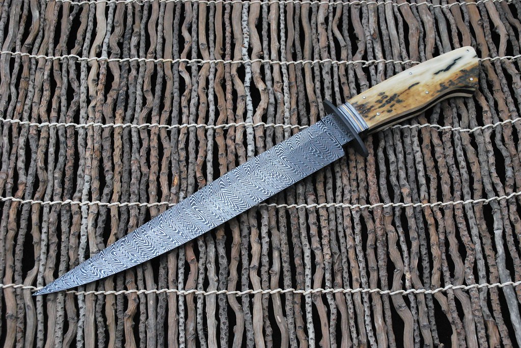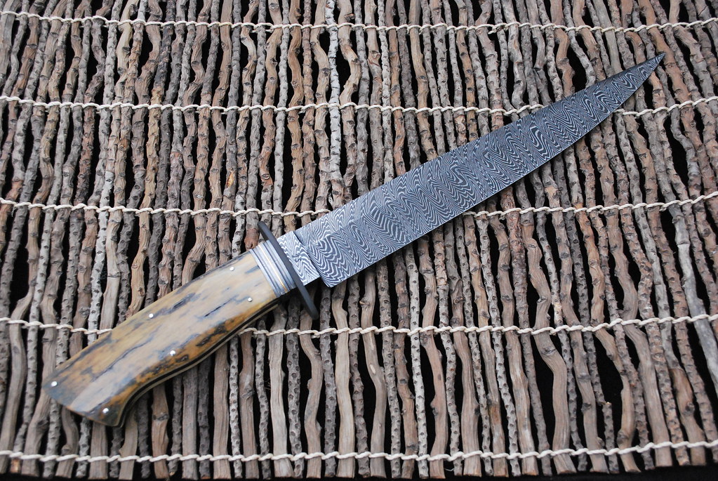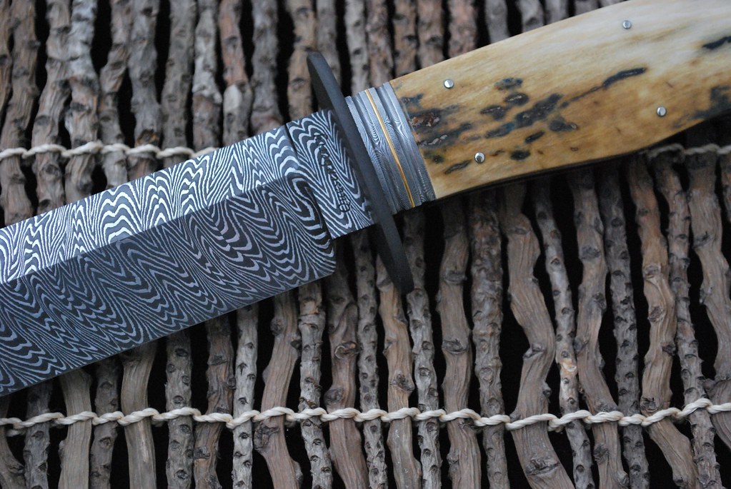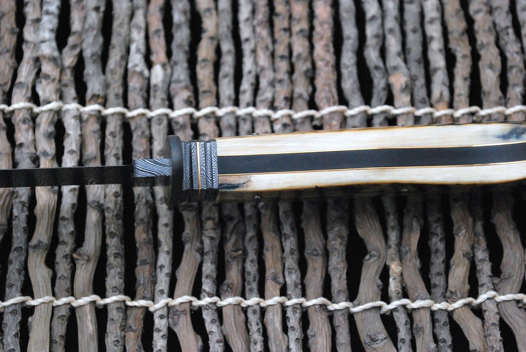 This is a 10" bladed fighter with a double grind and tiled W's of 1084 and 15N20. The OAL is 15". The frame and guard are O-1 that have been parkerized along with the damascus. It has NS liners that have been gold plated and twist damascus spacers. The mammoth, being the first time I've used this material, is held to the frame with NS domed pins. With the guard and frame I was going for a dark and ominous look to contrast the gold and shiny ivory. Hope you like it.
